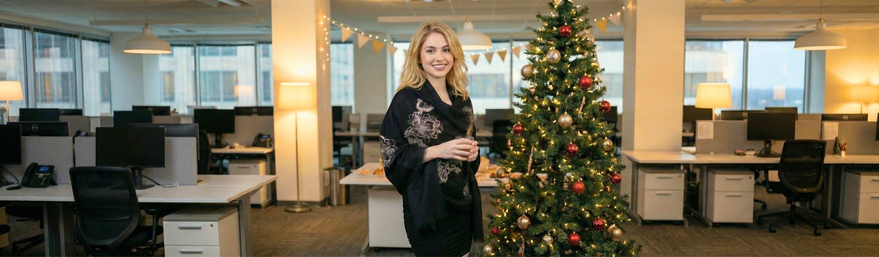 Colors that contrast with the gloom of the season are essential for winter events. Introduce a colorful, contrasting, fashionable scarf for women if the base of your office is a dark neutral like black or grey.