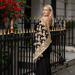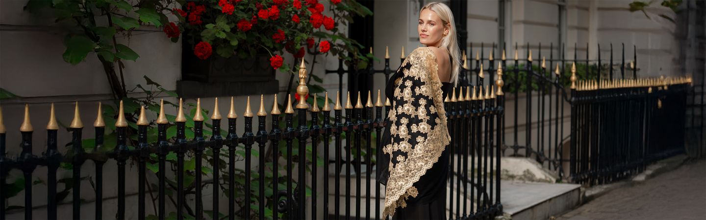 A lace-trimmed silk scarf draped over an evening dress makes for a refined yet striking statement, especially when paired with capes for women for an added touch of drama.