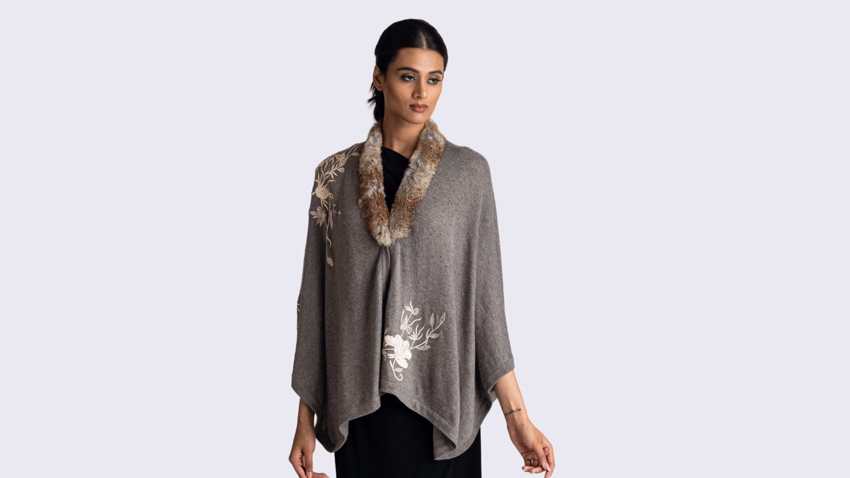 Black Cashmere ScarfBeige Embroidery & Black Lace