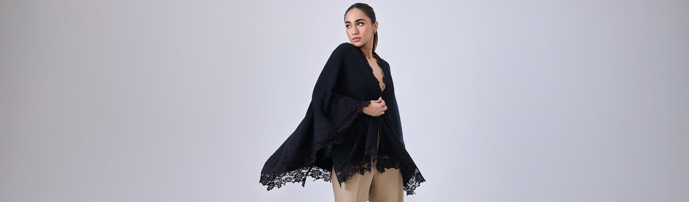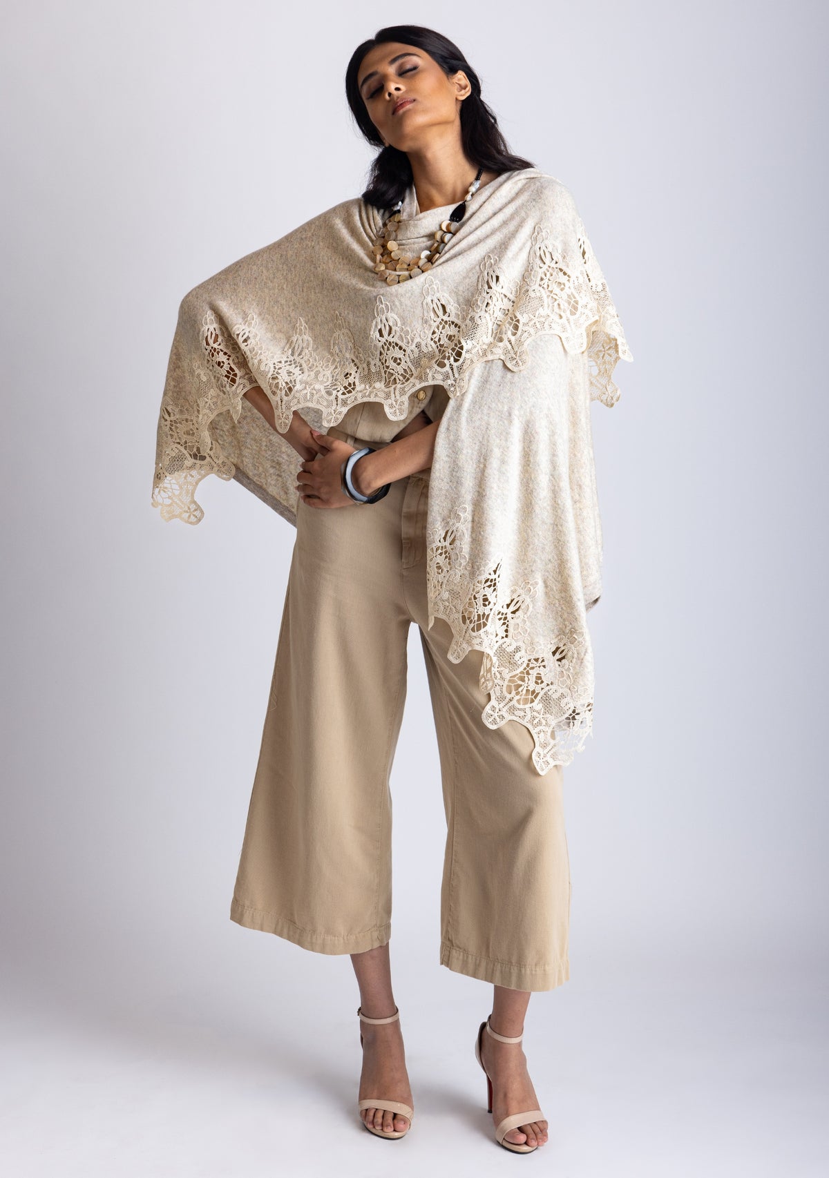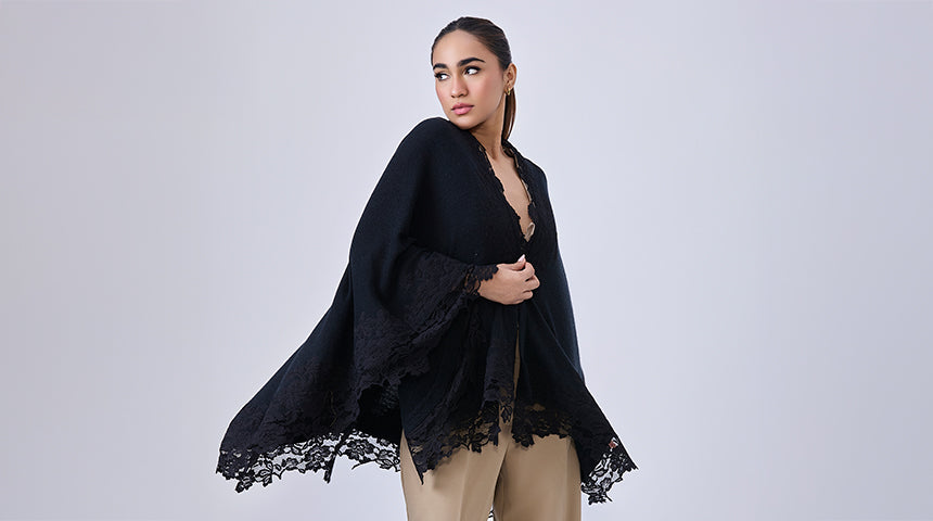 - For the office – A structured cape in neutral tones works beautifully over a pencil skirt or sleek dress. You can go for neutral shades like taupe or grey to layer over darker outfits. Or you can choose a simple black cape with lace appliques for contrasting with lighter outfits
