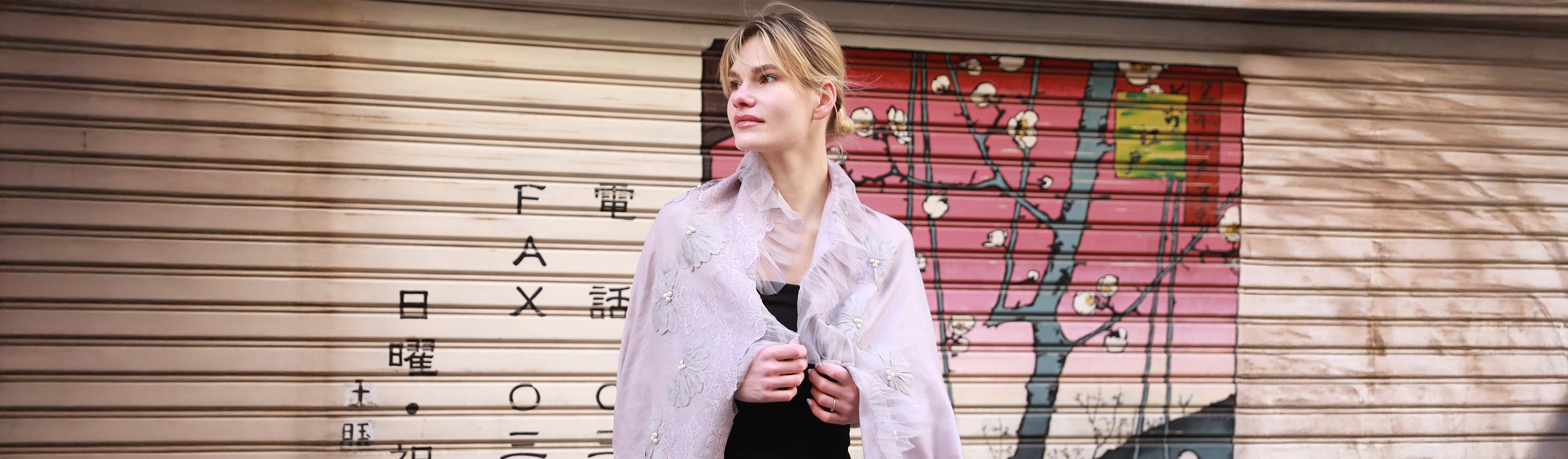 Spring is a season of contrasts—soft blossoms and textured bark, shimmering light and subtle shadows—and the collection reflects this interplay through its materials and finishes. The Lourdes scarf, for instance, combines the richness of light copper cashmere with tonal lace and 3D floral appliqués. Adding a whimsical twist, these flowers are paired with grey faux fur pom-poms, creating a piece that’s both playful and refined.