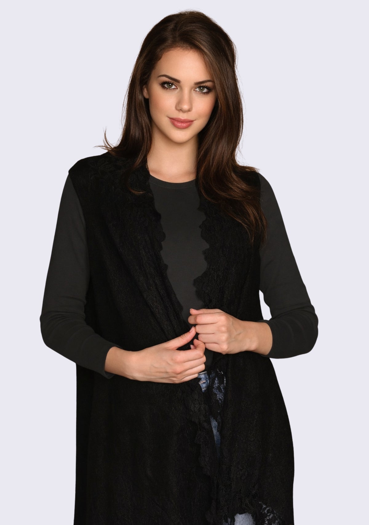 A classic black knitted sleeveless jacket crafted from a very soft fine wool. The look of this jacket is further elevated with a tonal black floral lace border making it a unique accessory that can be worn over any casual attire or to keep stylishly warm whilst traveling.