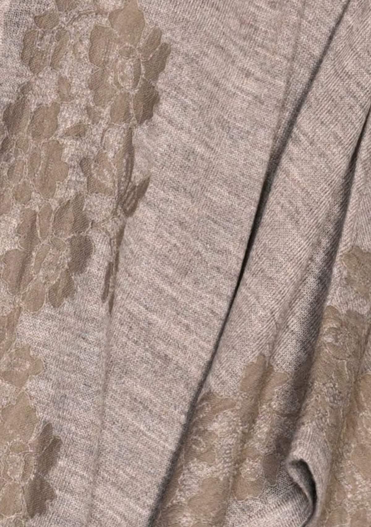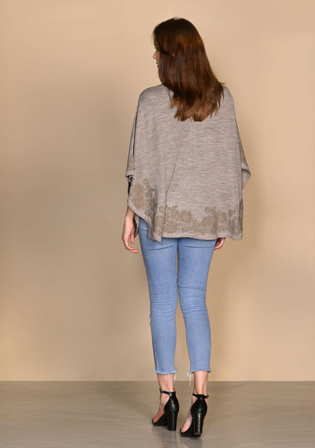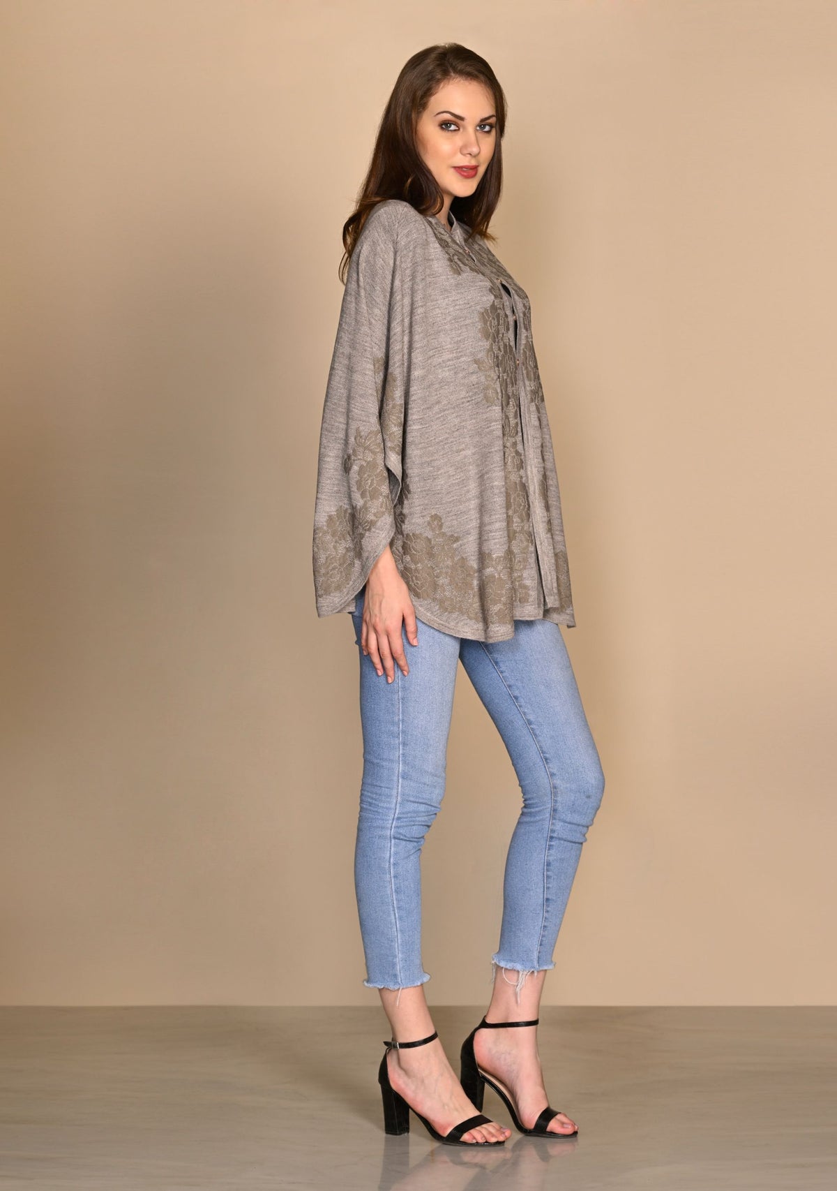 This taupe melange collared cape is knitted from a very soft fine wool. Its unique look is created by the application of contrasting dark taupe floral lace appliques. A free-flowing accessory to elevate any outfit day or night whilst keeping you comfortably warm.