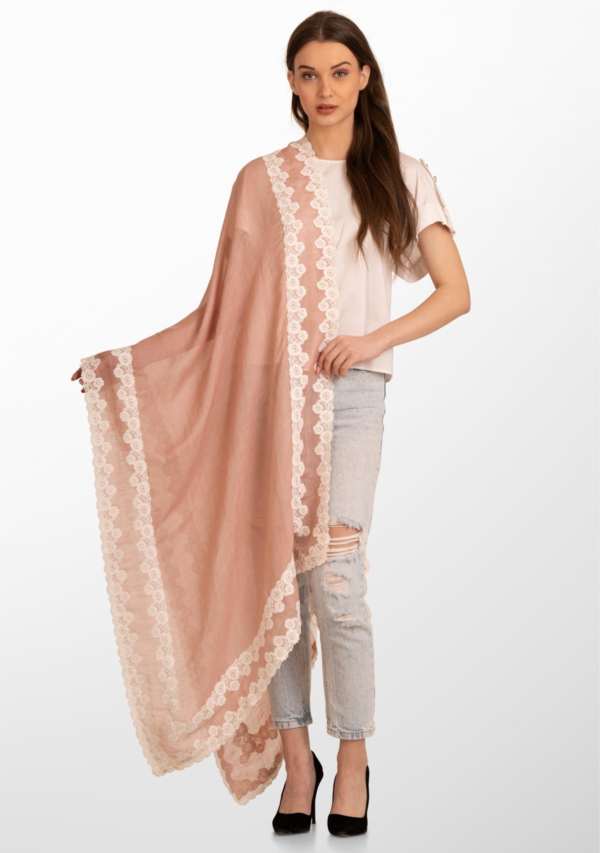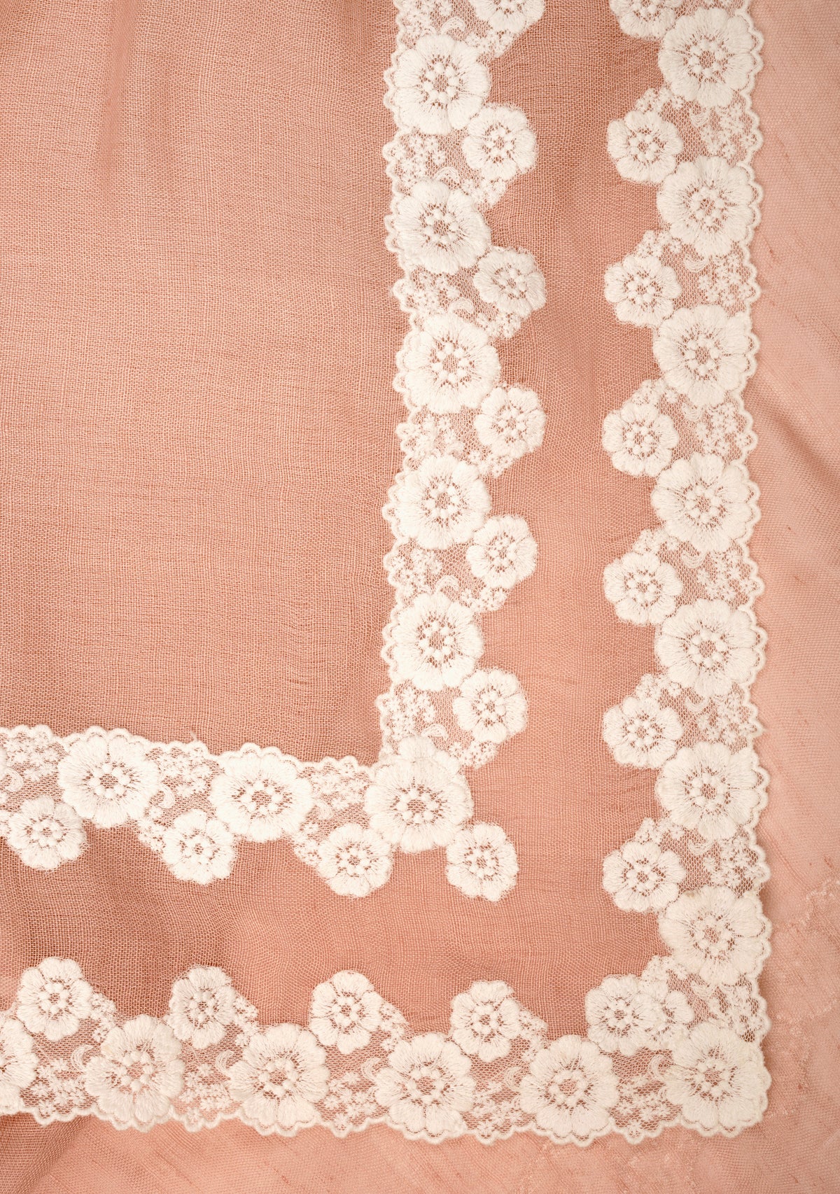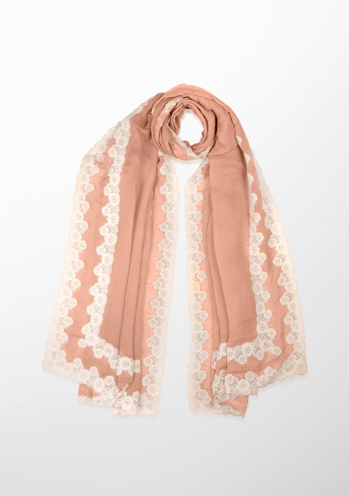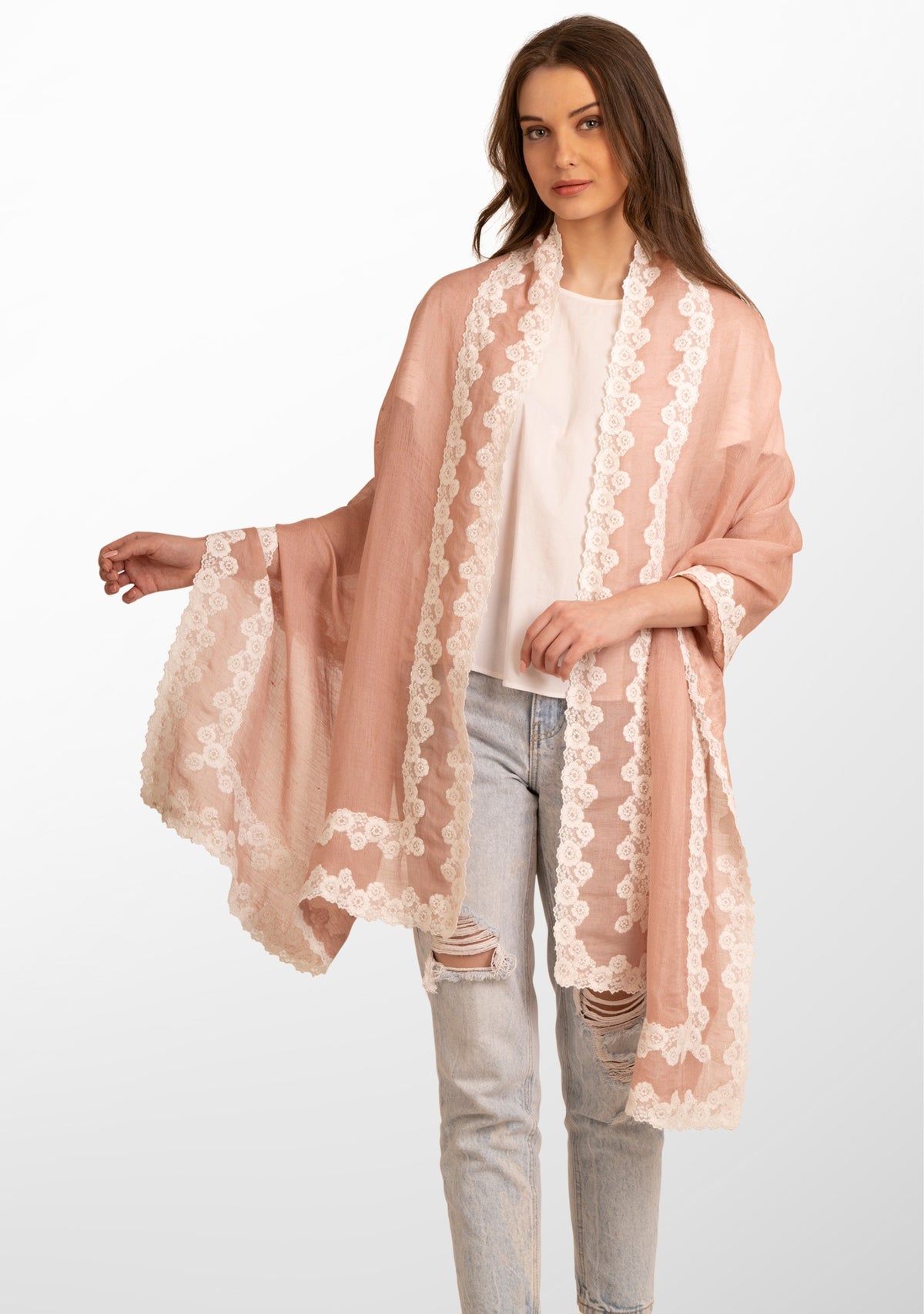 Indulge in the timeless allure of this gracefully handcrafted scarf. Created from a very light and airy linen and modal blend, this light copper scarf is emboldened by a contrasting double white floral lace border. The intricate lacework, reminiscent of blooming petals, adds a touch of romance to the scarf's design, creating a captivating visual interplay. This versatile accessory effortlessly transitions from casual to formal, providing a graceful complement to any ensemble.