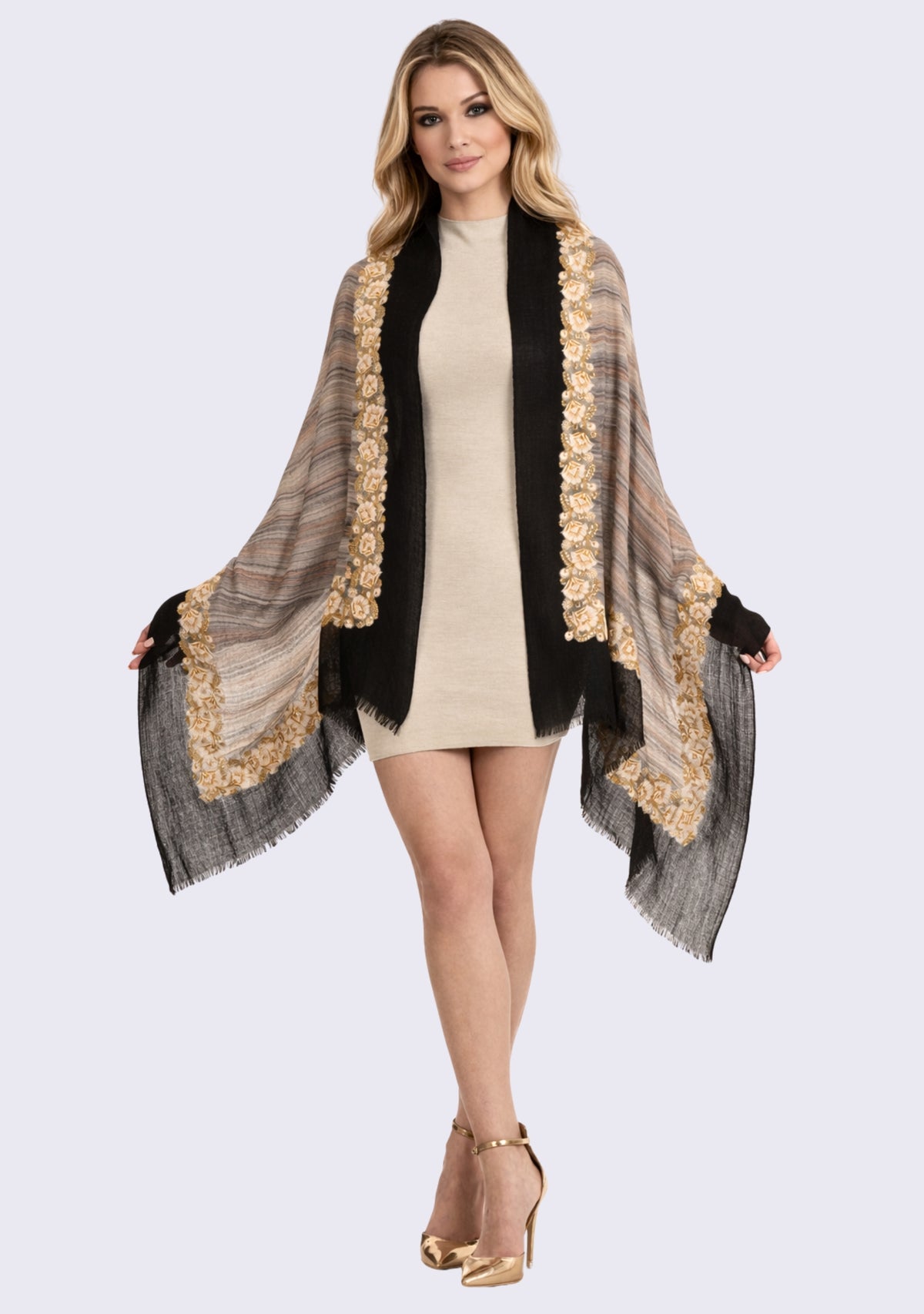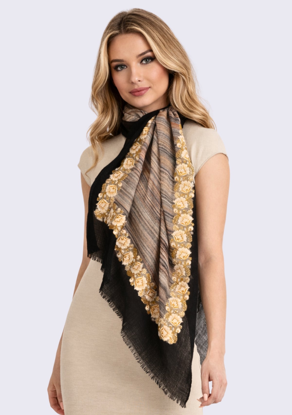 Wrap yourself in the cozy luxury of our brushed multi-striped wool and silk scarf featuring a black frame border for the ultimate tactile experience. Elevating its subtle elegance is an inside frame crafted from a mesmerizing, intricate dual-color ivory and gold embroidery applique border. The soft brushed texture harmonizes with the rustic hues, adding a sense of refined sophistication. Whether casually draped or adorned for a formal occasion, this scarf seamlessly strikes the perfect balance between comfort, style and elegance, making it a very versatile accessory.