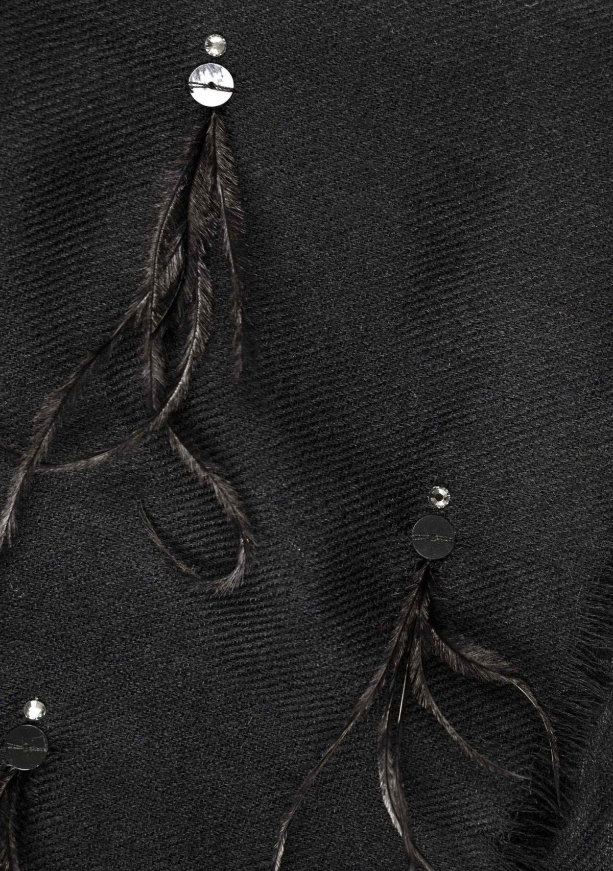 This black pashmina scarf is crafted from the finest cashmere. It is a stunning head-turner adorned with a combination of black ostrich feathers, black sequin and contrasting antique silver Swarovski crystals scattered across the scarf. Meticulously handcrafted, this piece is a classic combination of luxury and sophistication. The ostrich feathers add opulence, whilst the scattered sequins and Swarovski crystals bring a subtle yet dazzling allure. Preserved for special occasions, this must-have accessory seamlessly combines comfortable warmth with extravagant detailing. The fusion of the various handcrafted elements creates the perfect look of glamour and timeless beauty, a piece that will stay fashionable for years.