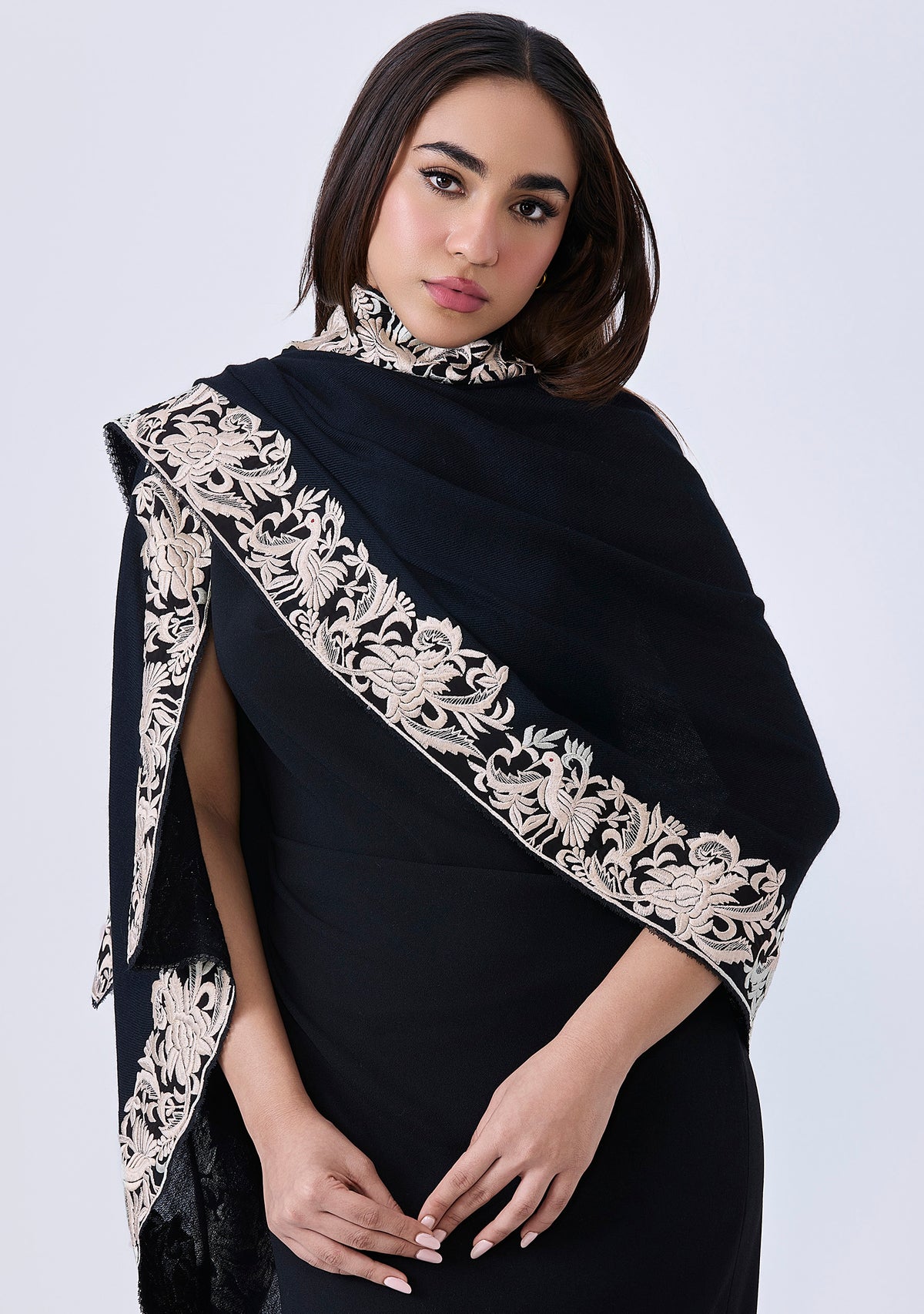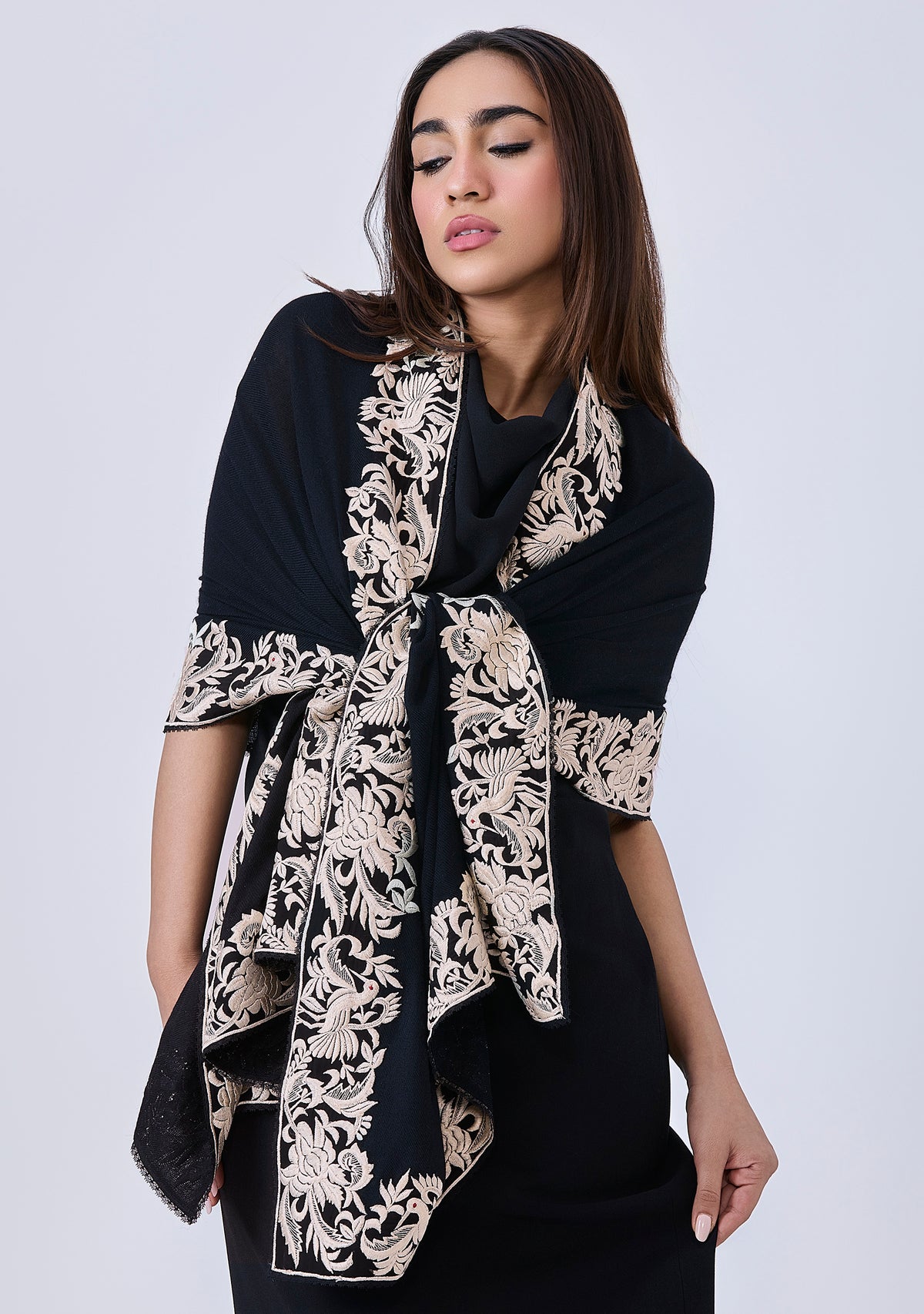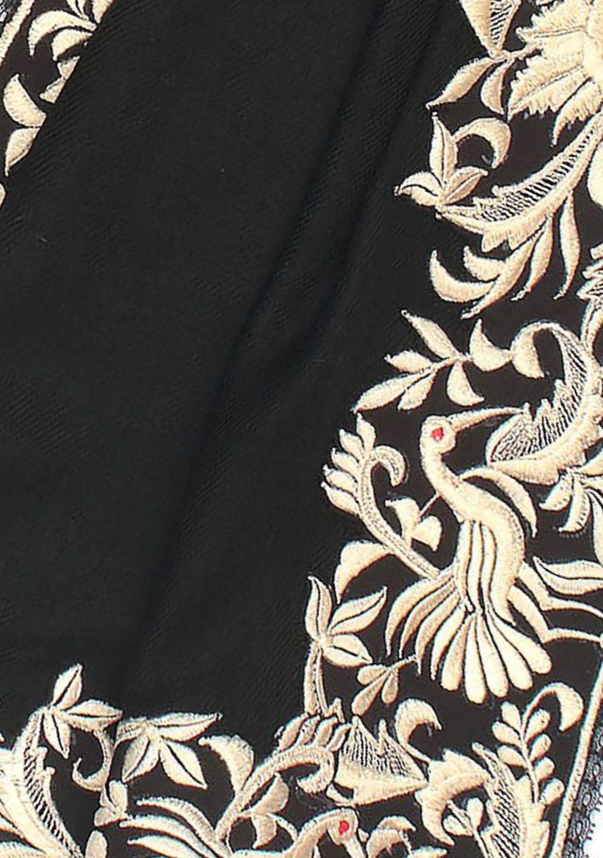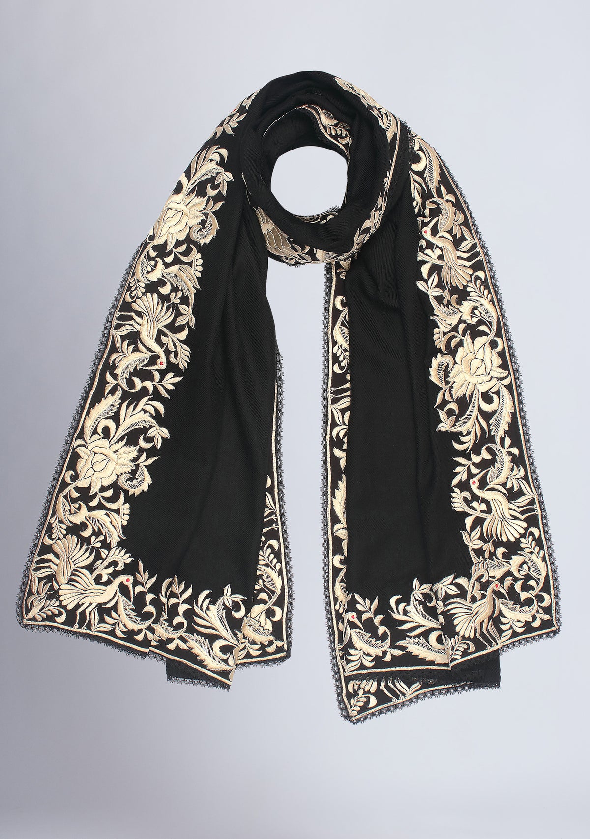 This luxurious black cashmere scarf features a stunning inner border of a floral-bird embroidery in a contrasting ivory color. Elevate your style by wrapping yourself with elegance, style, and warmth in this captivating scarf finished with a tiny tonal black-colored lace edging. A perfect accessory for all occasions.