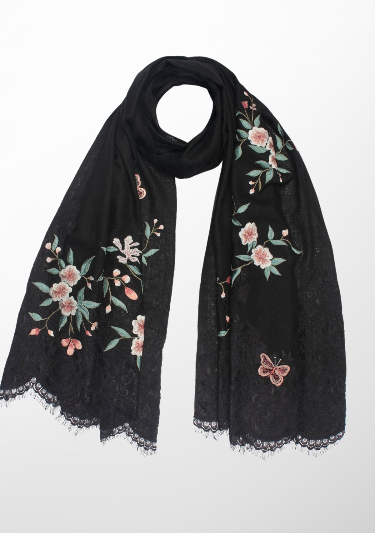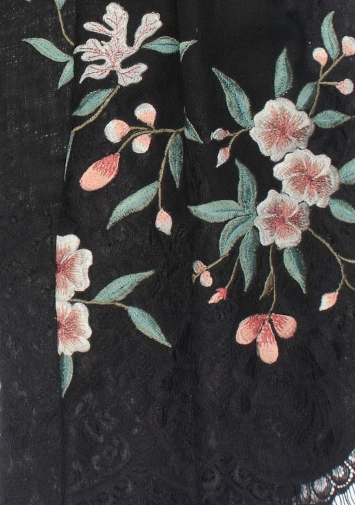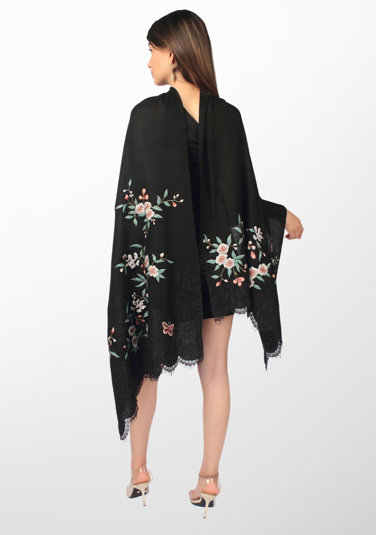 Black Cashmere ScarfMulti-colored Embroidery & Black Lace