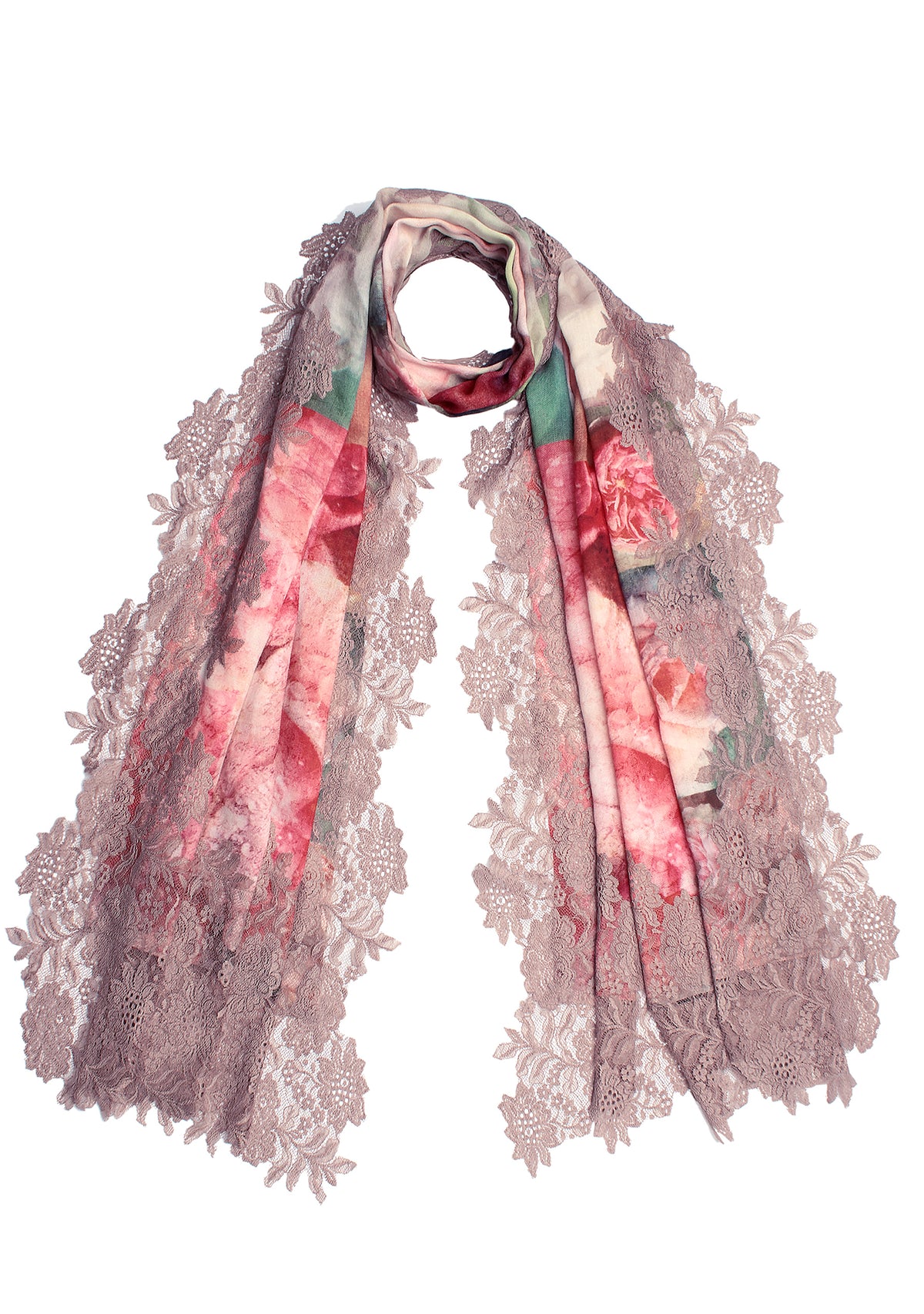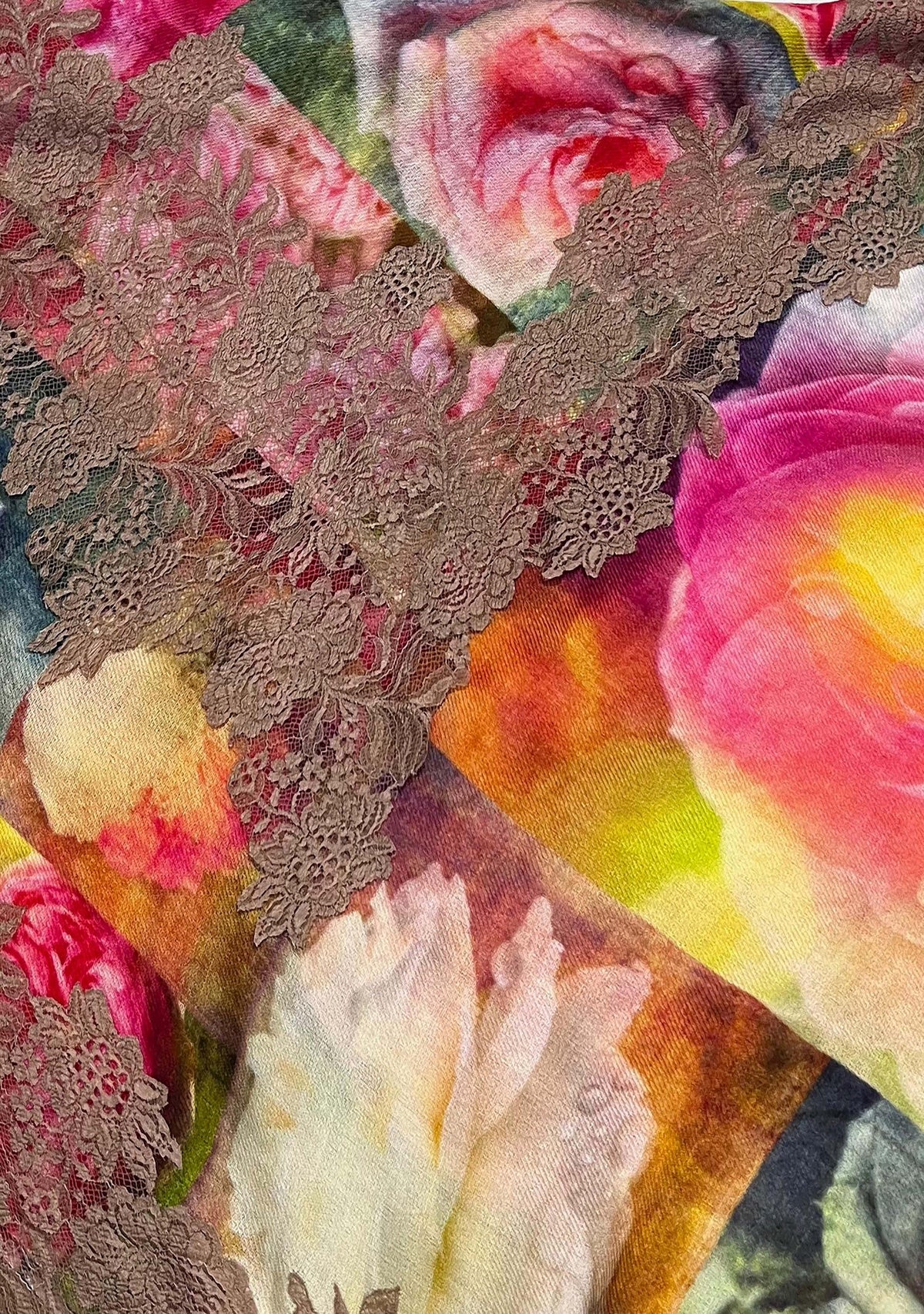 Immerse yourself in a world of romance and charm with this roses print scarf. The scarf features a delightful print of delicate roses, adding a touch of whimsy and elegance to your ensemble. Crafted from a blend of wool and silk, it offers a luxuriously soft and smooth feel against your skin. The scarf is further adorned with a sienna-colored floral lace border, showcasing intricate details and a graceful feminine flair. Wrap yourself in beauty and grace whilst keeping comfortably warm.