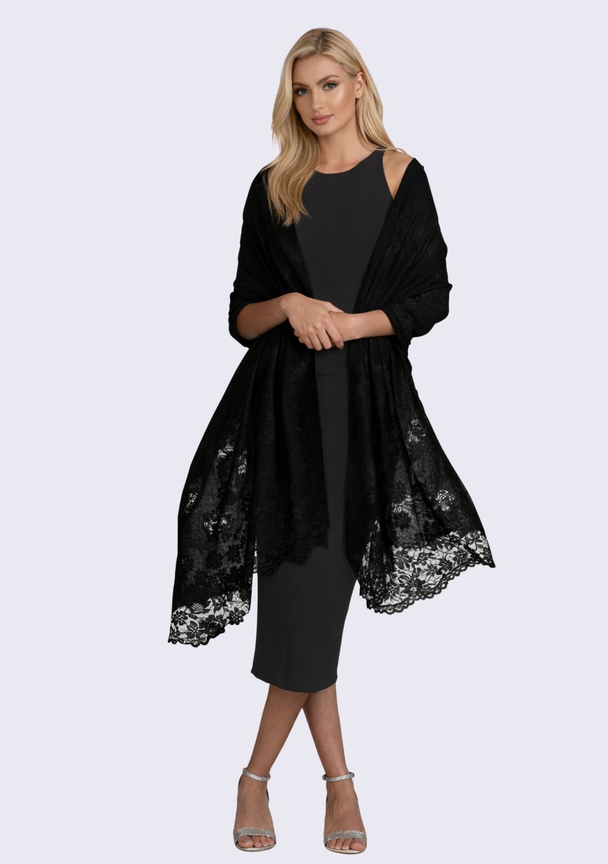 Woven from the finest cashmere, this classic black scarf features an intricately handcrafted application of an exotic tonal black Chantilly lace extending inward in a vine pattern from the ends of the scarf. The luxurious cashmere fabric ensures both warmth and comfort whilst the stunning lace application adds a touch of sophistication with unparalleled charm, giving this scarf timeless appeal with a modern edge. You can style yourself with versatile ease in multiple ways, making this scarf the perfect accessory for any formal occasion, day or night. Make heads turn with your elevated fashionista look.