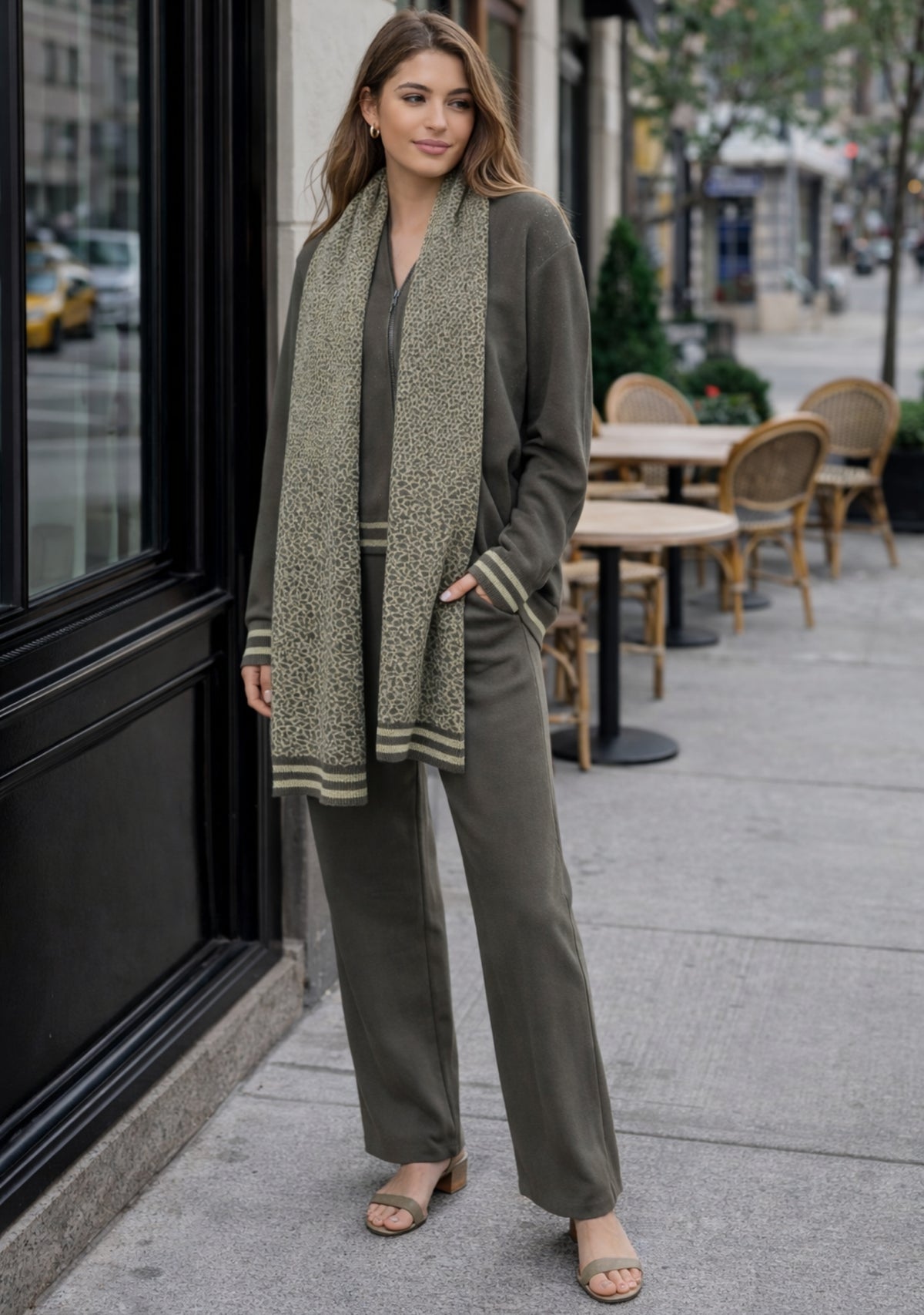 Dk. Olive & Frappe Leopard Jacquard Jacket and Dk. Olive Pant Lounge Set