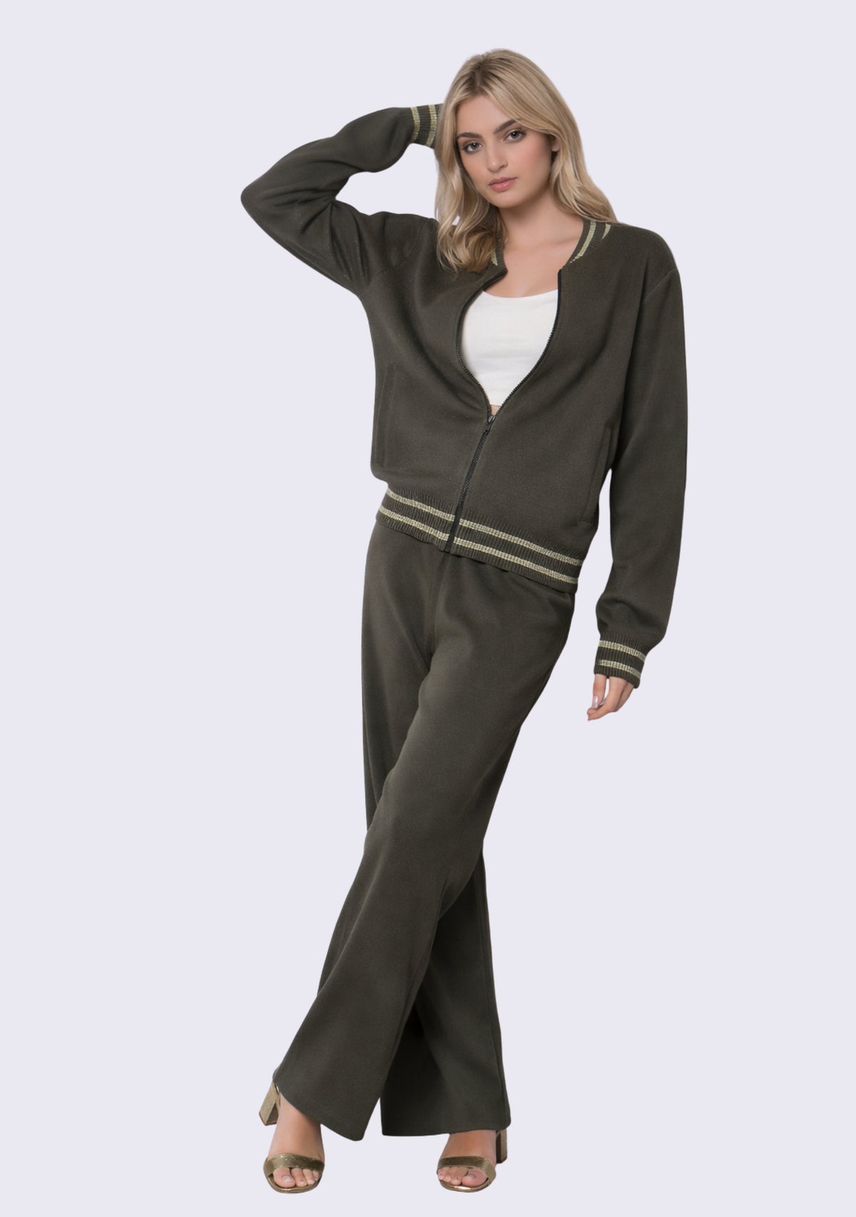 This stylish and trendy lounge set consists of a dark olive and frappe leopard jacquard cotton and viscose bomber style jacket with plain black cotton pants. The jacket also includes a full front zipper, pockets and ribbed hem and cuff trim, making for the perfect outfit to travel in style whilst keeping comfortably cozy.