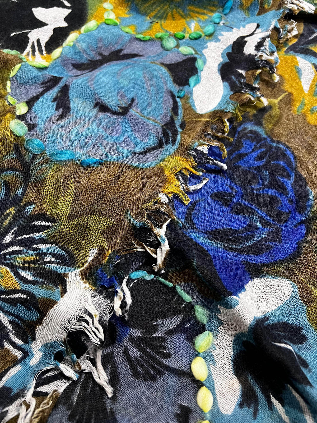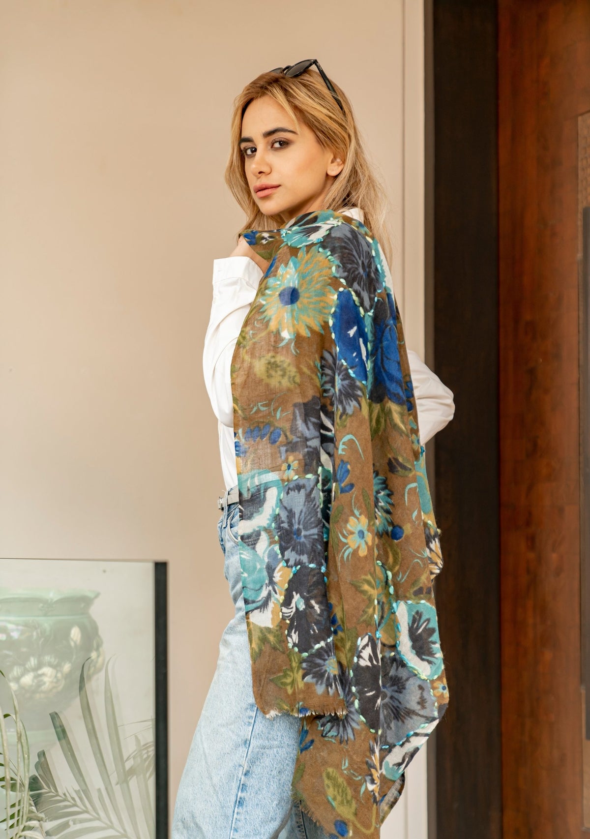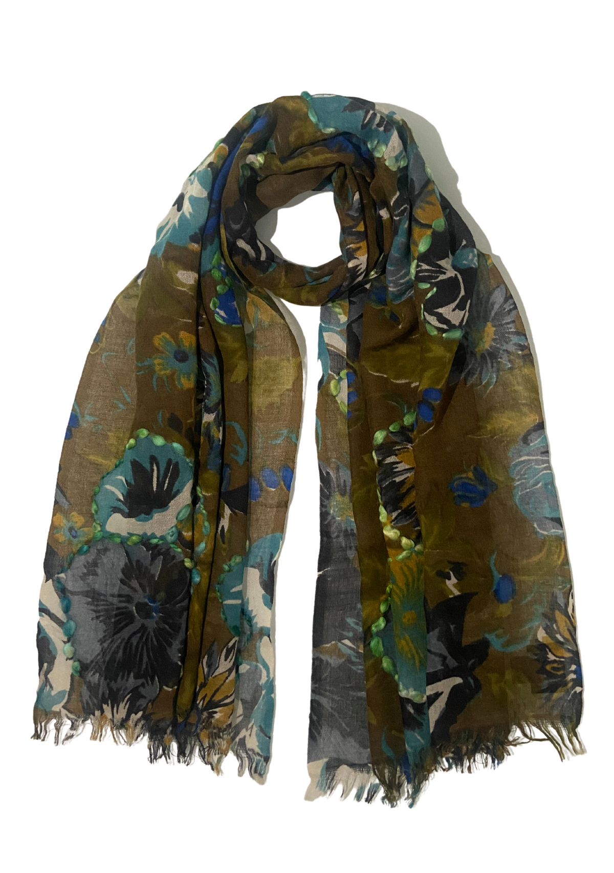 Khaki Wool ScarfCluster Print & Multi-colored Embroidery
