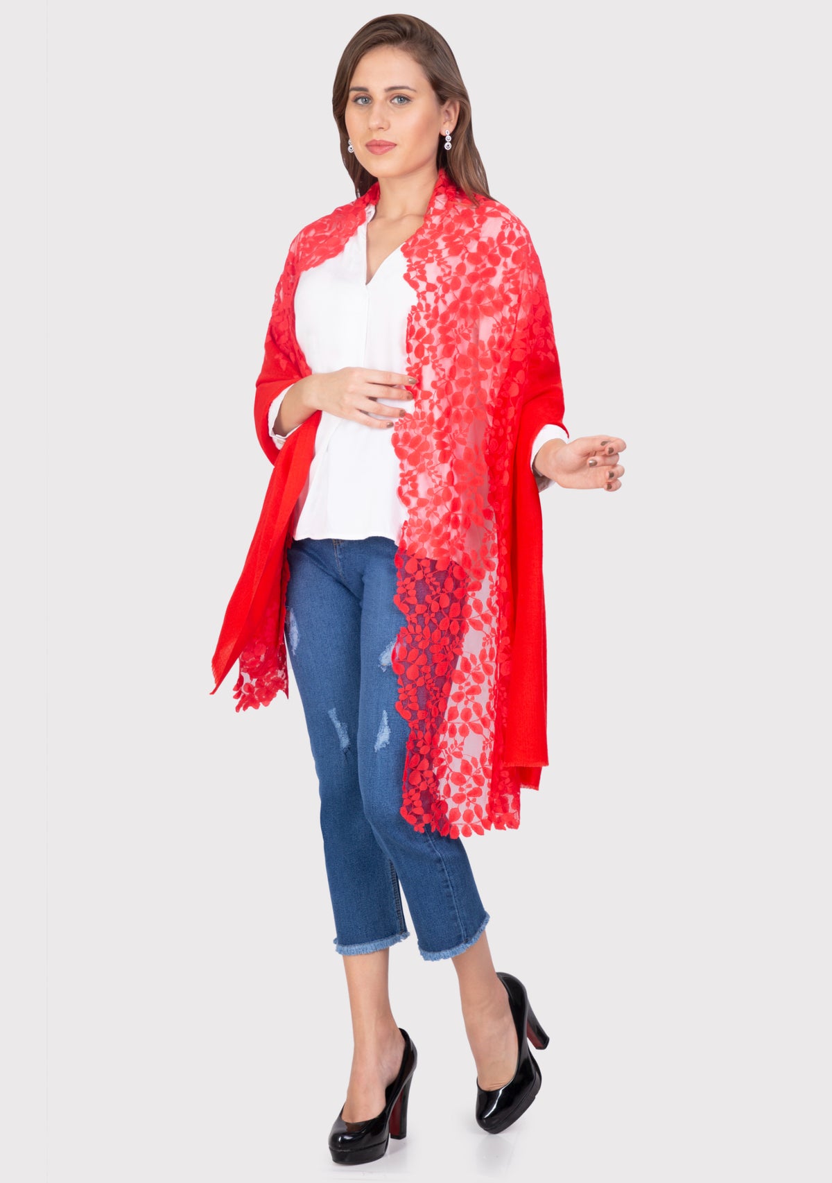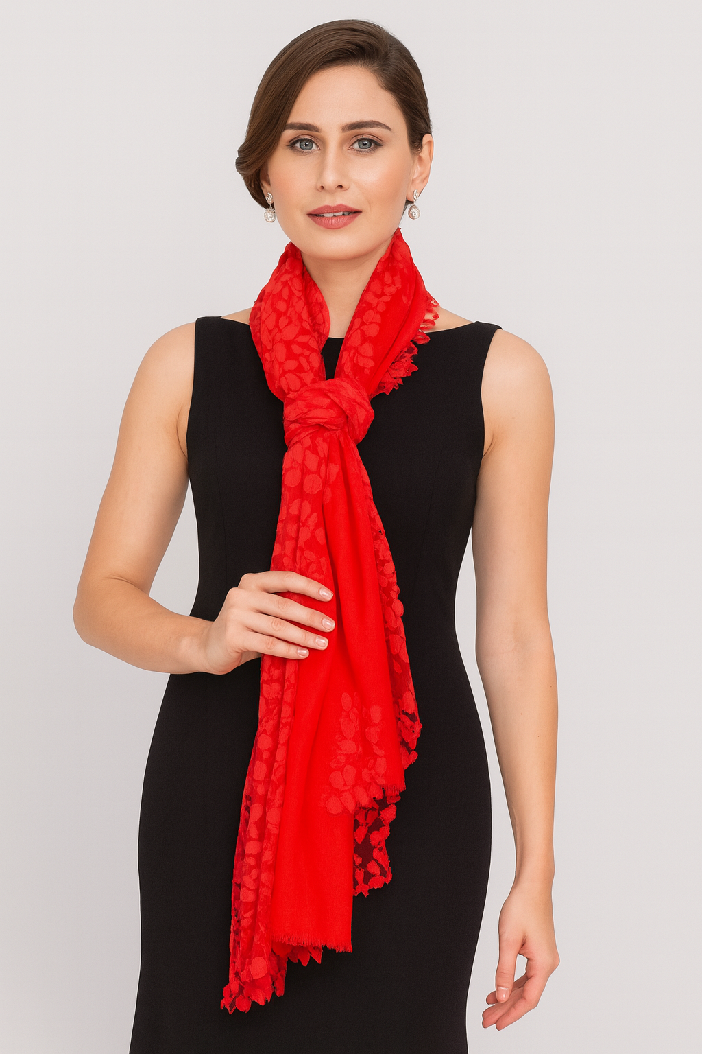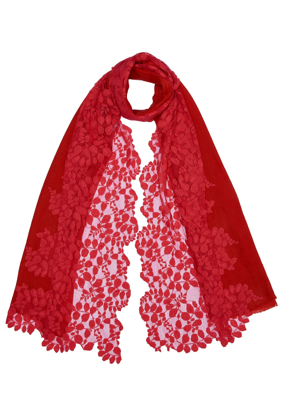 Crafted from a very soft silk and wool blend, this wispy bright tomato red scarf is emboldened with a substantial tonal tomato red leaf-patterned lace, giving it a distinctive yet utterly feminine look. A gorgeous accessory to any daytime wear.