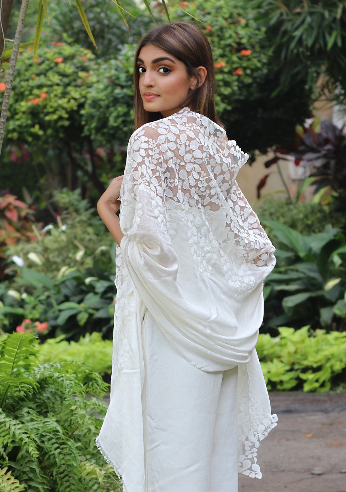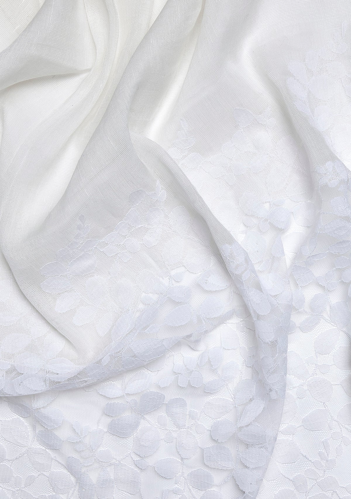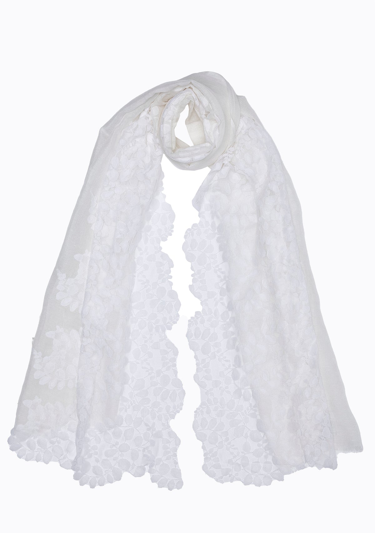 Crafted from a very comfortable and light blend of linen and modal, this wispy ivory scarf is emboldened with a substantial tonal ivory leaf-patterned lace, giving it a distinctive yet utterly feminine look. A gorgeous accessory to any daytime wear.