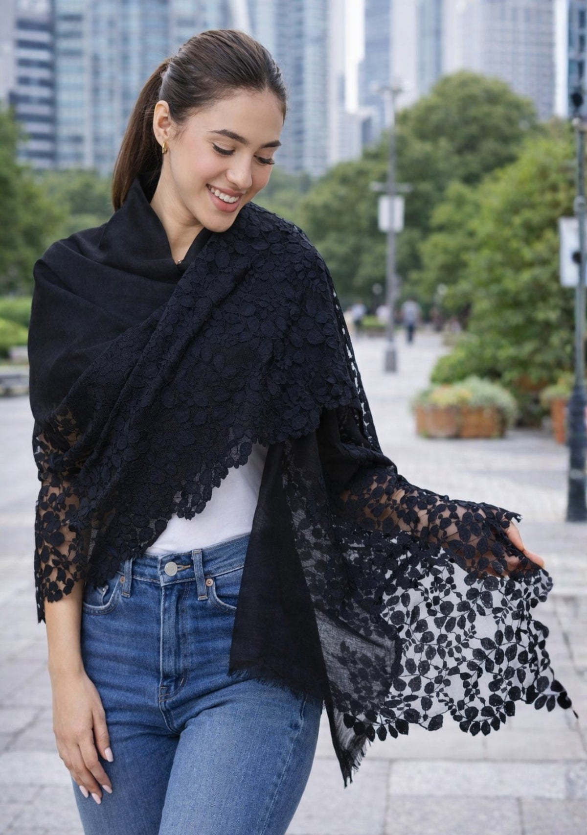 Crafted from a very comfortable and light blend of linen and modal, this wispy black scarf is emboldened with a substantial tonal black leaf patterned lace giving it a distinctive yet utterly feminine look. A gorgeous accessory to any day time wear.