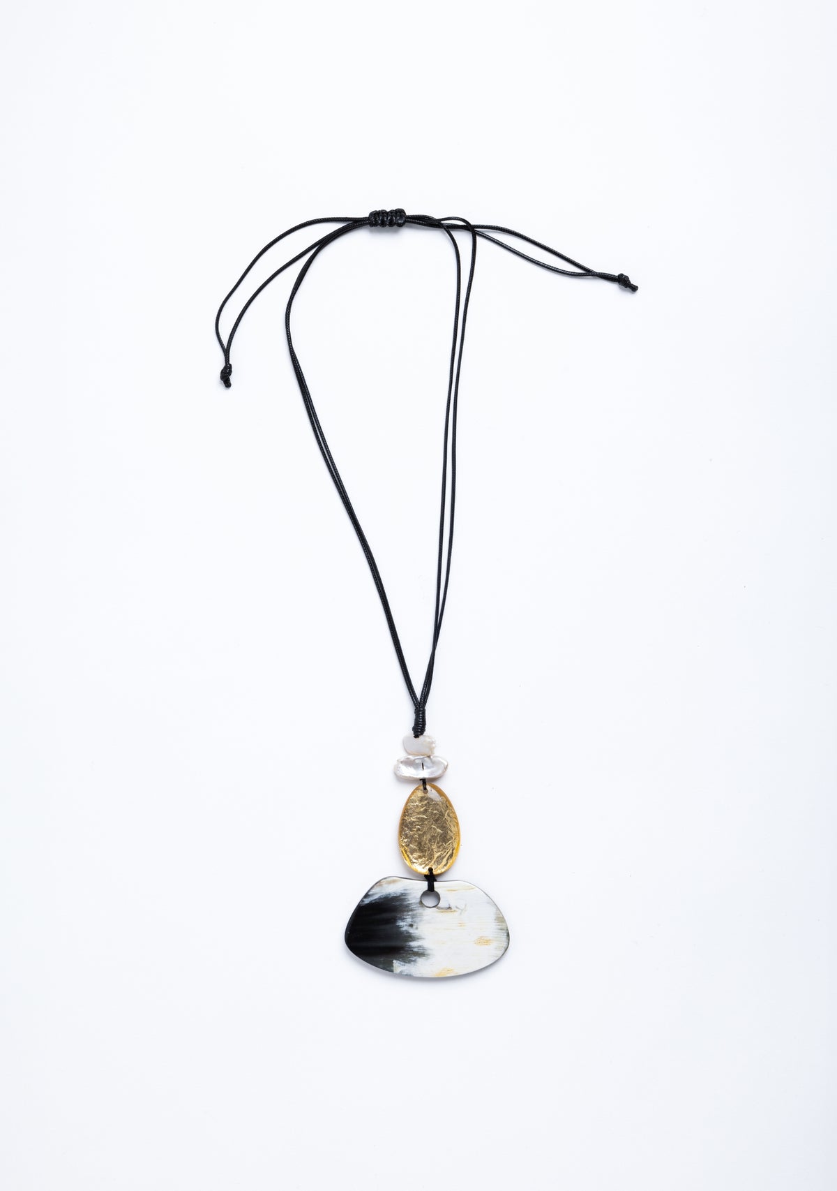This one-of-a-kind pendant necklace features a black cord adorned with two small, uniquely-shaped white baroque pearls, a stunning natural-gold resin drop, and finally, completing the ensemble, a large, irregular-shaped ethically-sourced buffalo horn piece in an interplay between white and black. Whilst the pearls bring with it an organic beauty, the resin drop provides a warm, radiant glow with the buffalo horn adding an element of depth and visual interest. The combination of these elements creates a striking balance of textures and colors, making this a versatile accessory suitable for both casual and formal occasions. Lightweight and thoughtfully crafted, this necklace celebrates sustainable materials and showcases the artistry of handmade jewelry, perfect for those who appreciate unique and ethical fashion.