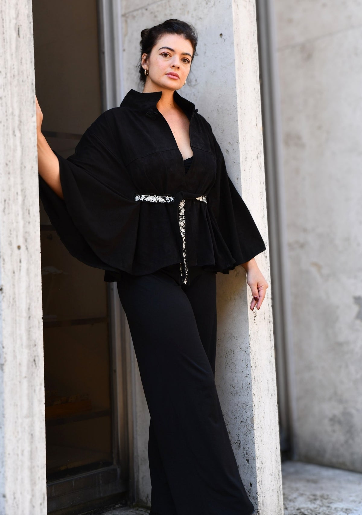 The black colored Aurora suede jacket takes the cape silhouette and gives it a modern edge. Cut from soft suede leather, it's finished with a sharp standing collar and a tie-waist belt hand-detailed in contrasting ivory embroidery. The shape pulls in at the waist yet moves freely, making it the go-to layer for transitional seasons. Whether layered over everyday basics or styled with a dress. Aurora is contemporary elegance.