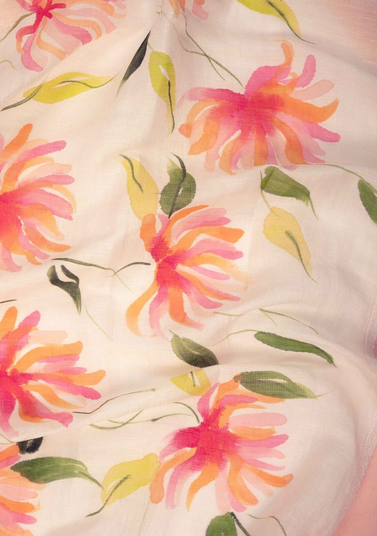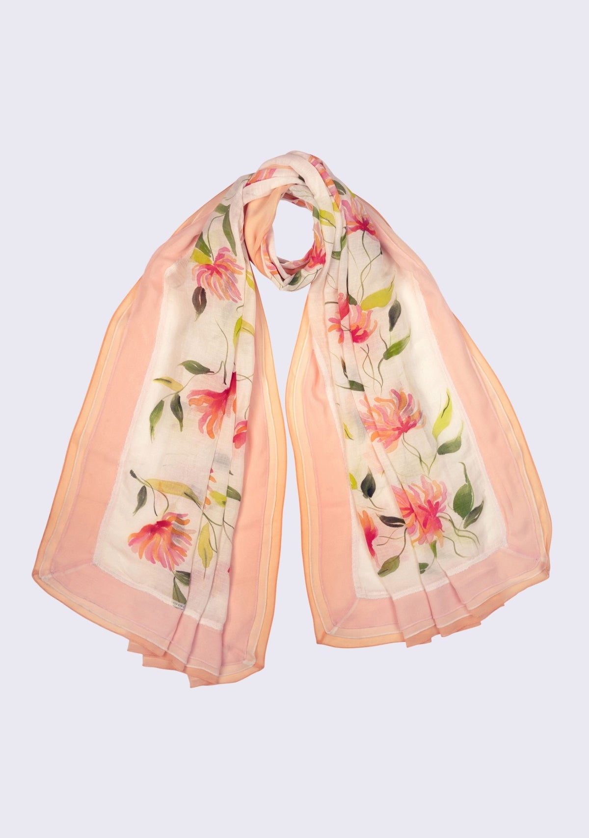 This is an exquisite and unique ivory linen scarf. Boasting a hand-painted multi-colored floral design in delicate shades of light peach, ivory and light pink, it exudes a charming feminine allure. The addition of a 3-layered Viscose georgette border in the same 3 colors and a thin ivory-colored filigree lace enhances the scarf's intricate beauty. Style yourself with this one-of-a-kind accessory to add grace and oomph to your daytime ensemble.