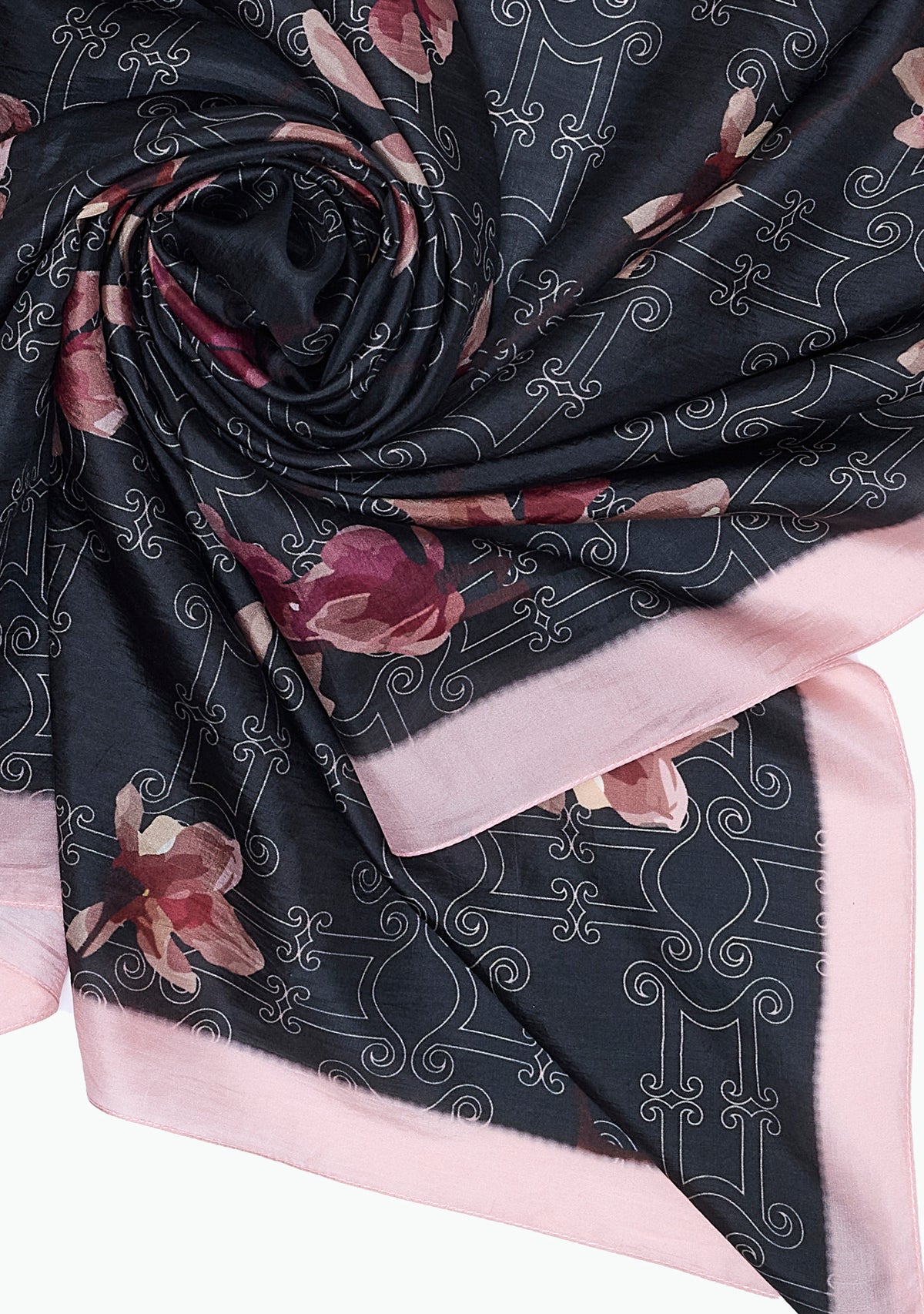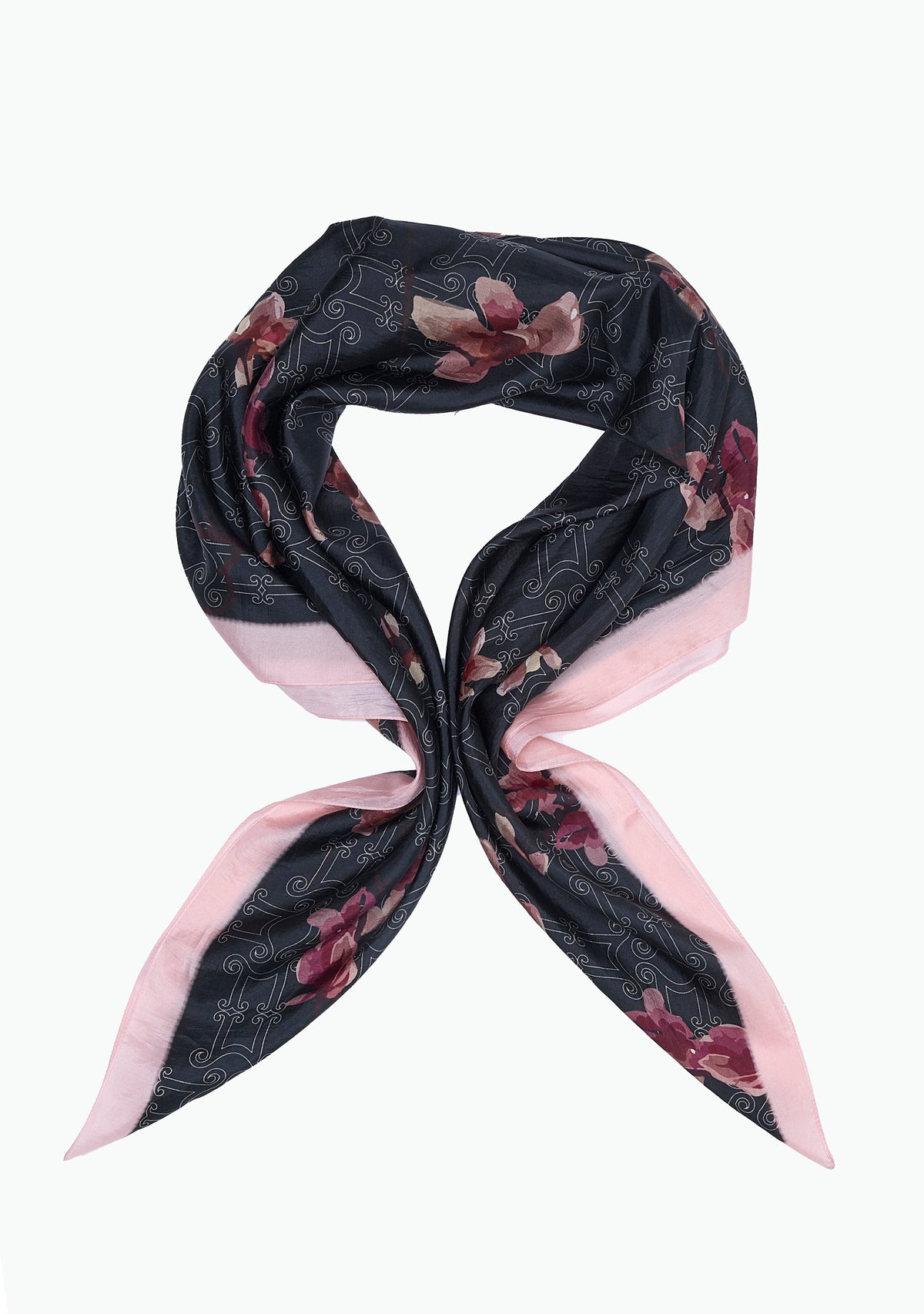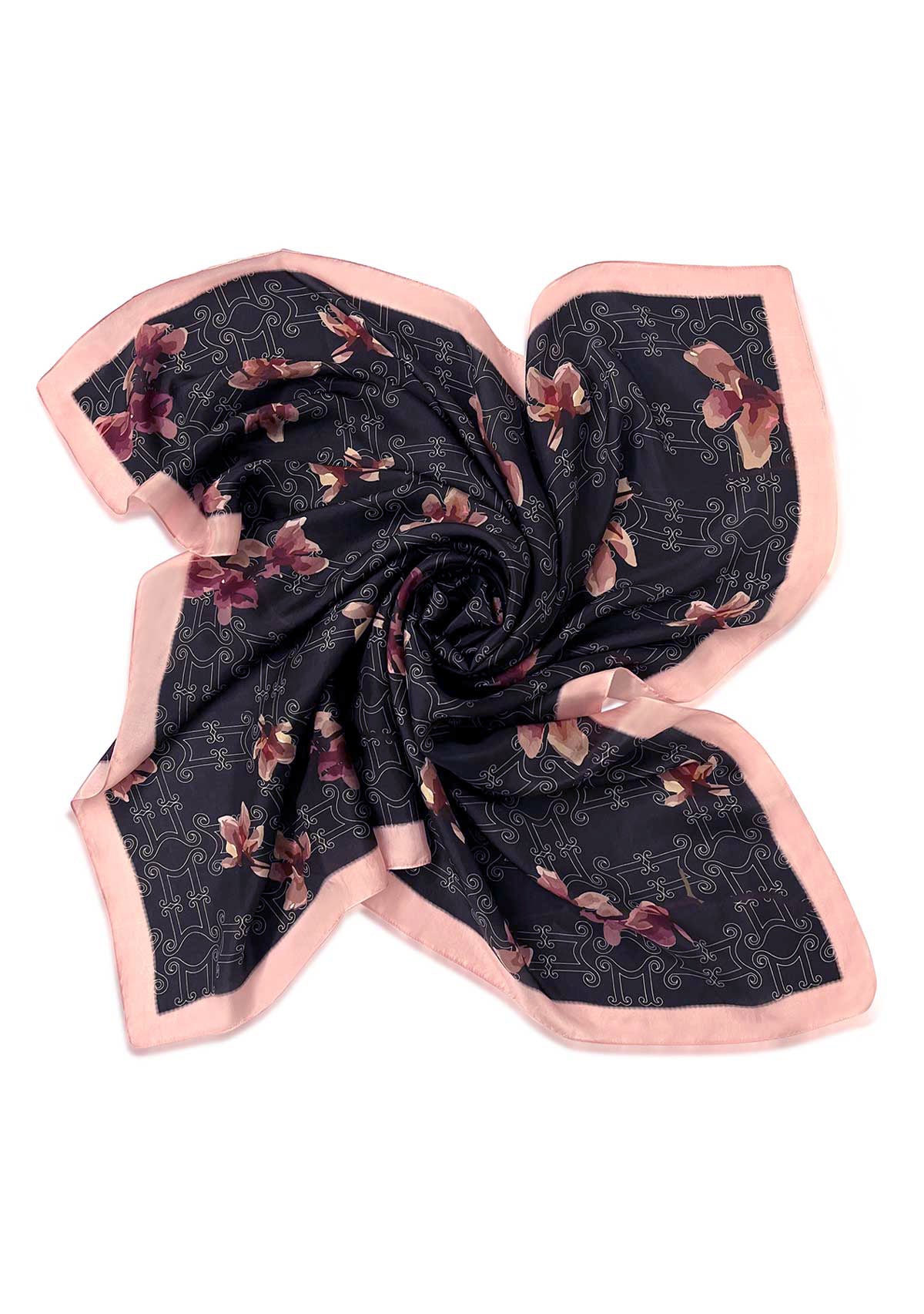 A classic silk square scarf with a pattern created by our monogram and our love for orchid flowers. The scarf is bordered in our brand pink and is a bold touch to every look.