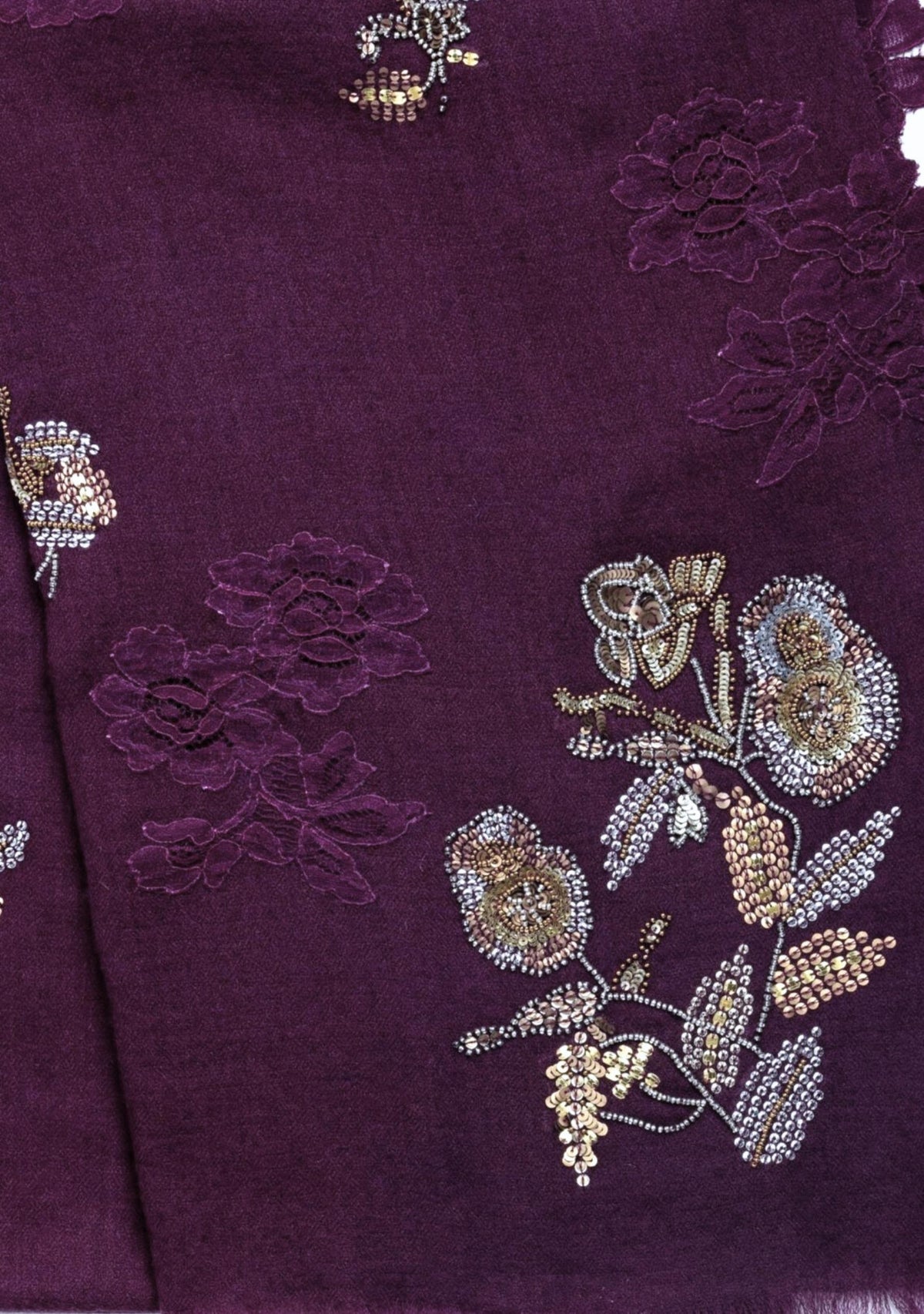 Plum Cashmere ScarfMetallic Hand-Embroidery & Plum Lace