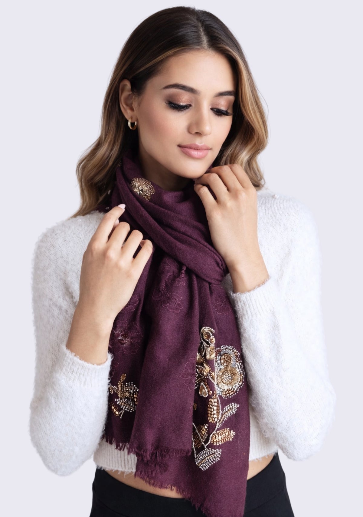 Wrap yourself in the luxurious elegance of our plum cashmere scarf, intricately embellished with metallic gold and silver sequin hand-embroidery that adds a dazzling shimmer. The exquisite tonal floral lace appliques enhance the scarf's rich color and texture, creating a captivating blend of sophistication and artistry. Crafted from a luxuriously soft 100% cashmere, this scarf is a perfect blend of warmth, comfort, and style. Whether draped casually or styled for a special occasion, this stunning accessory effortlessly elevates your look, making it an essential addition to your collection.