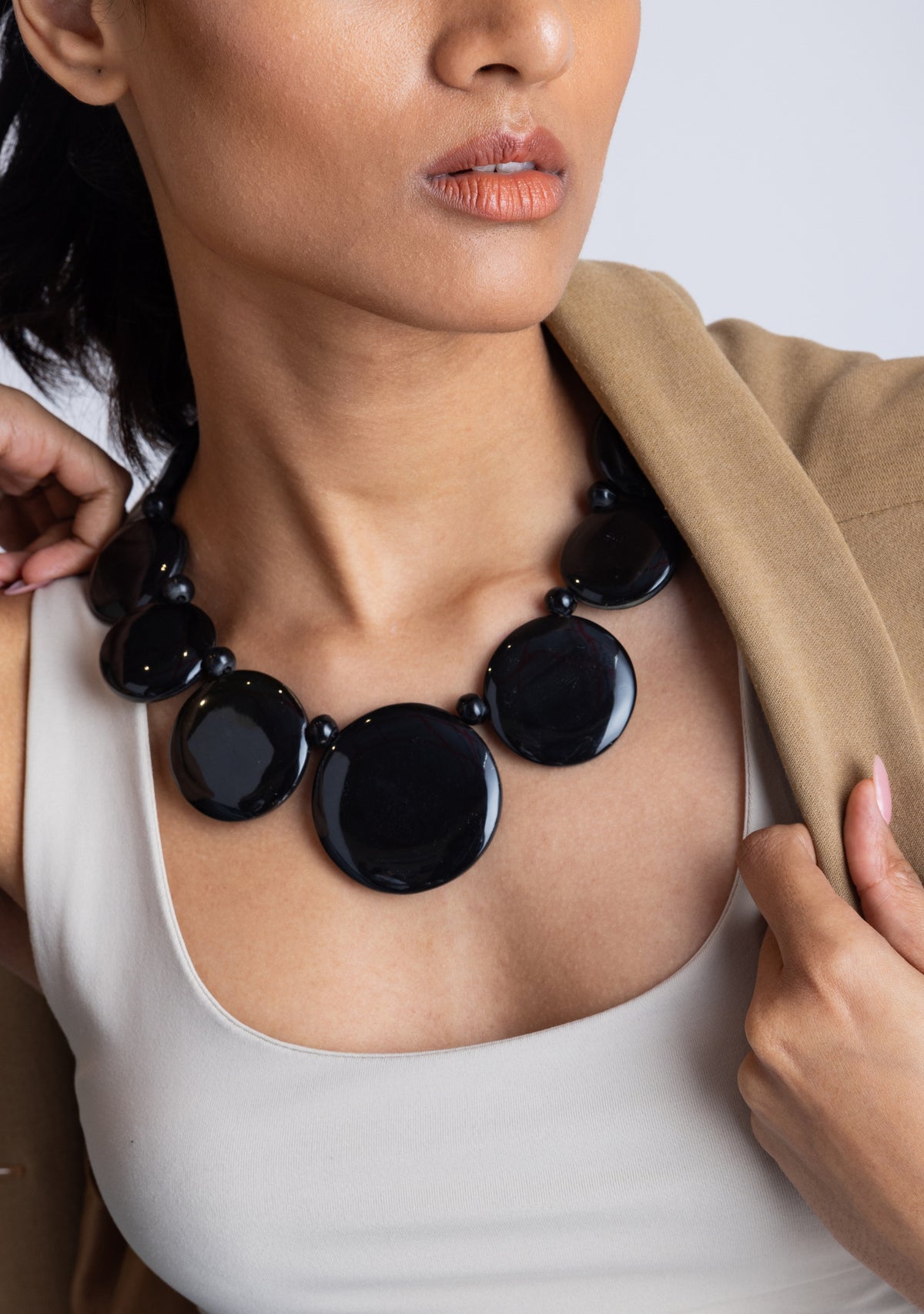 Make a bold statement with this stunning reversible buffalo horn disk necklace. Crafted from ethically sourced buffalo horn, each disk showcases two sides - one is black for an all-black look whereas the reverse is a rich gradient from deep ebony to soft charcoal, highlighting the material's unique natural color variations. The polished disks create a striking contrast against the skin, draping elegantly around the neck. This versatile piece elevates both casual and formal outfits, embodying contemporary design and modern artistry.