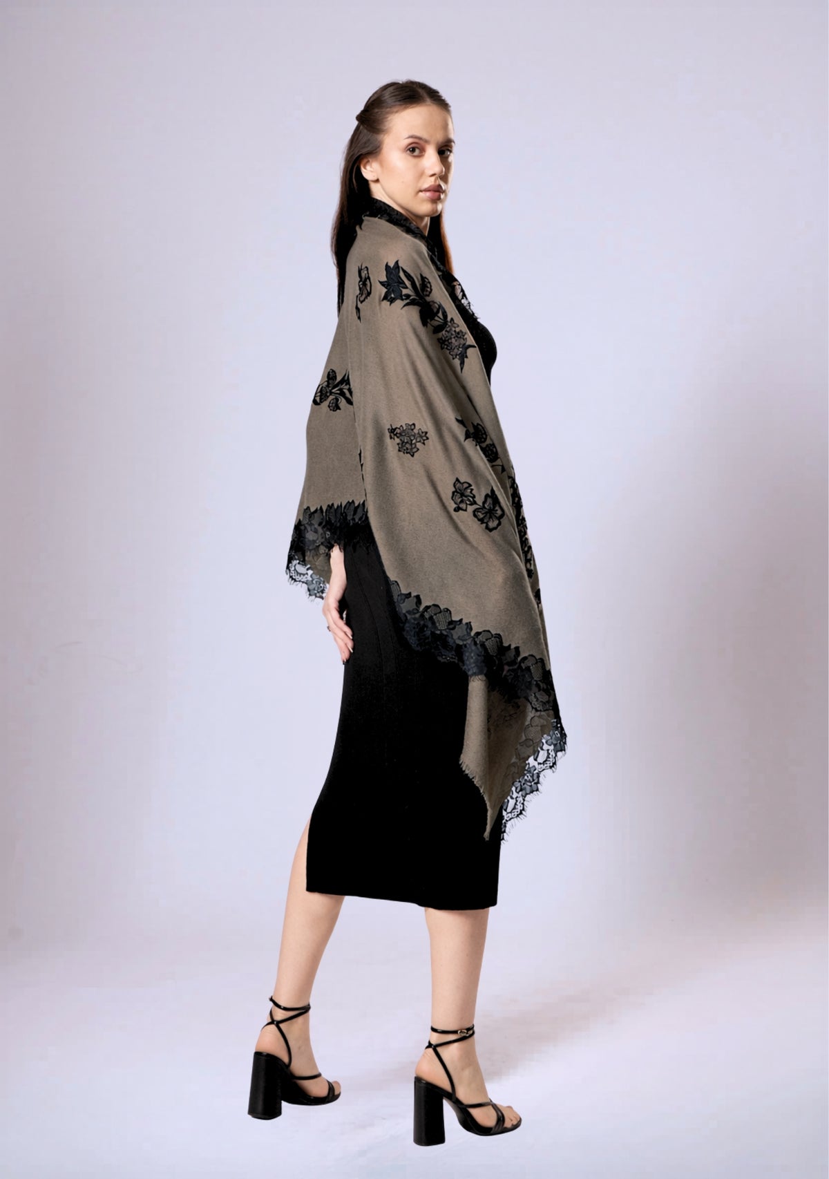 Taupe Cashmere Scarf Black & Taupe Floral Embroidery & Black Filigree Lace