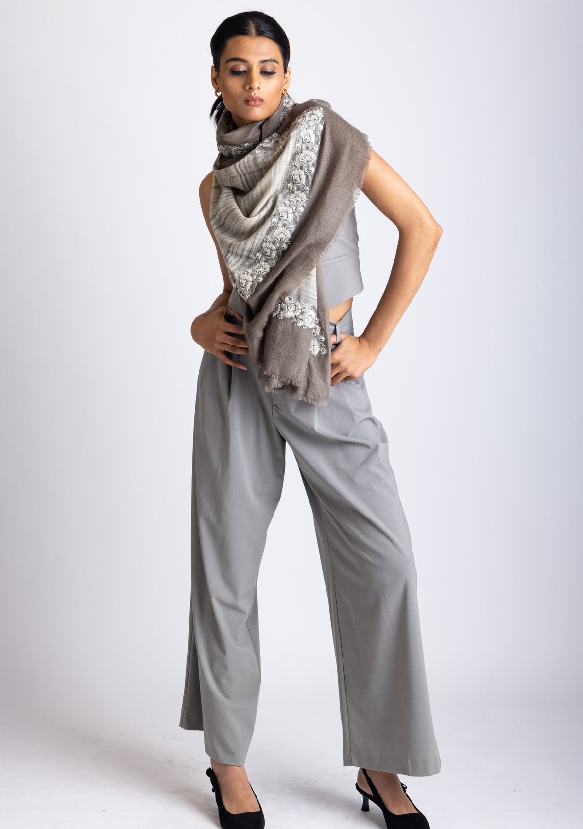 To achieve this look, drape the scarf over your shoulders with one end longer than the other, then casually toss the longer end over your opposite shoulder. This simple yet dramatic style works best with lightweight fabrics like a wool and silk blend, allowing the scarf to cascade gracefully.