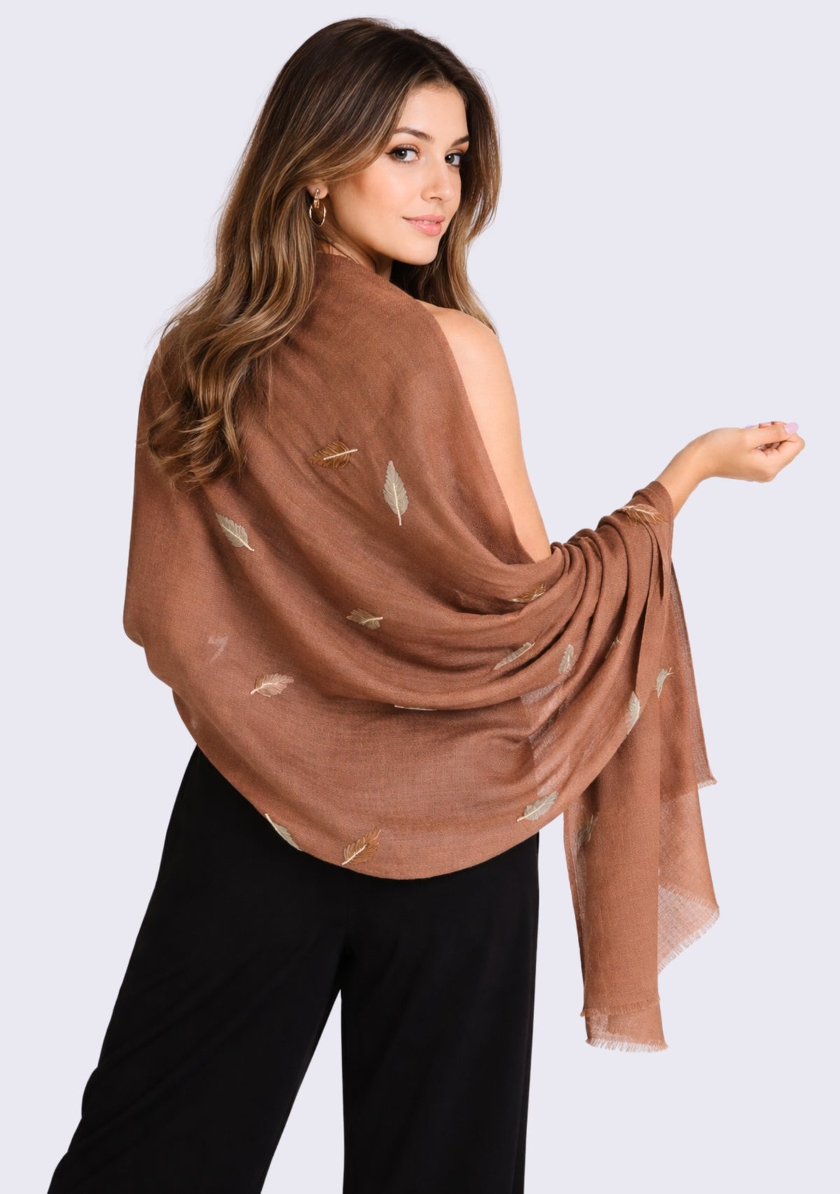 This brown scarf is woven from an incredibly soft wool and silk featuring a combination of taupe and brown handcrafted leaf embroidery all over, further elevated by a string of ivory pearls. With an eyelash fringe finish at the ends, this scarf makes for a perfect casual yet trendy accessory to keep you fashionably warm day or night.