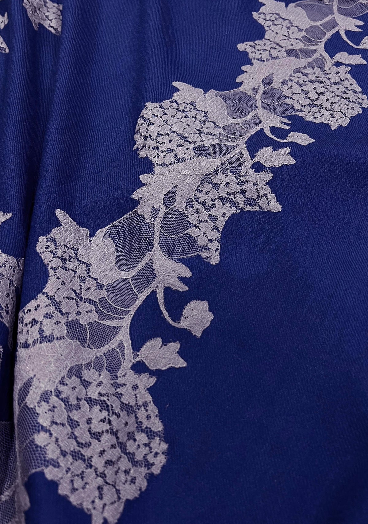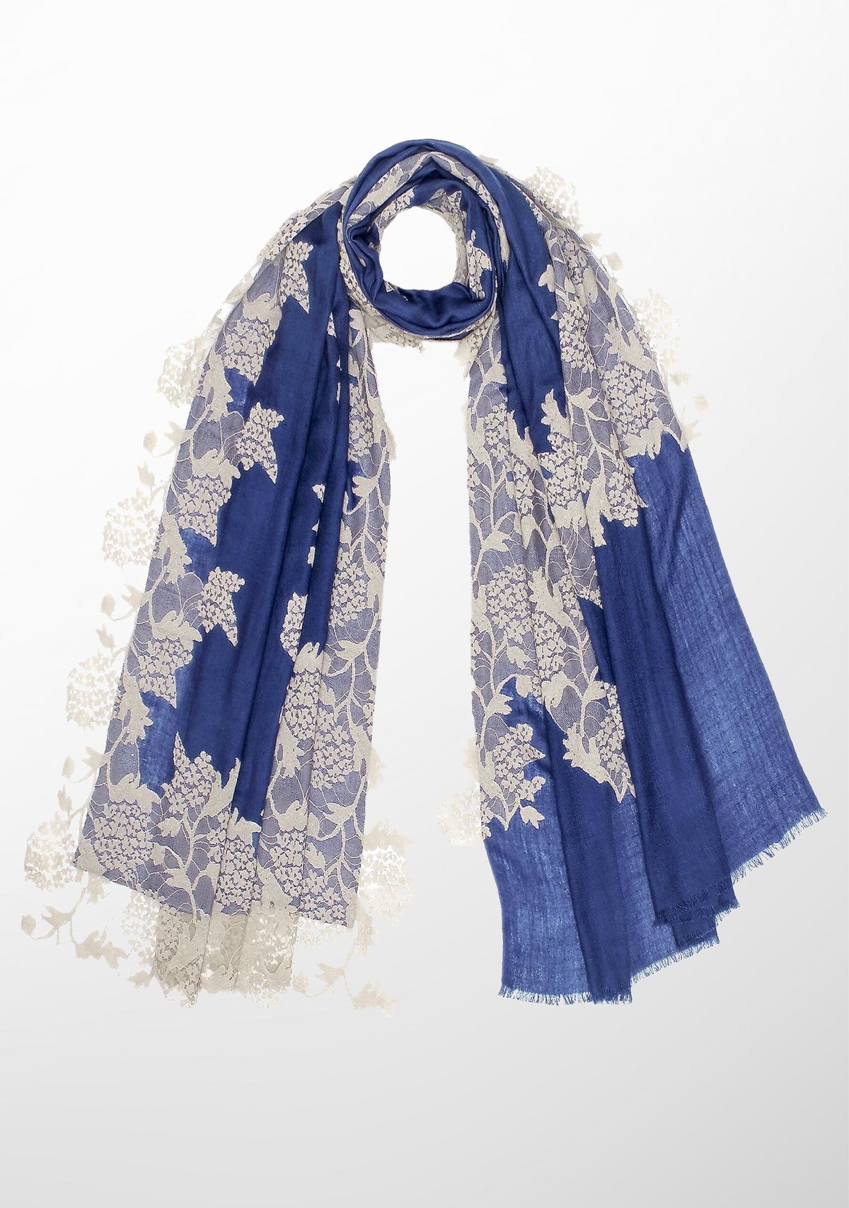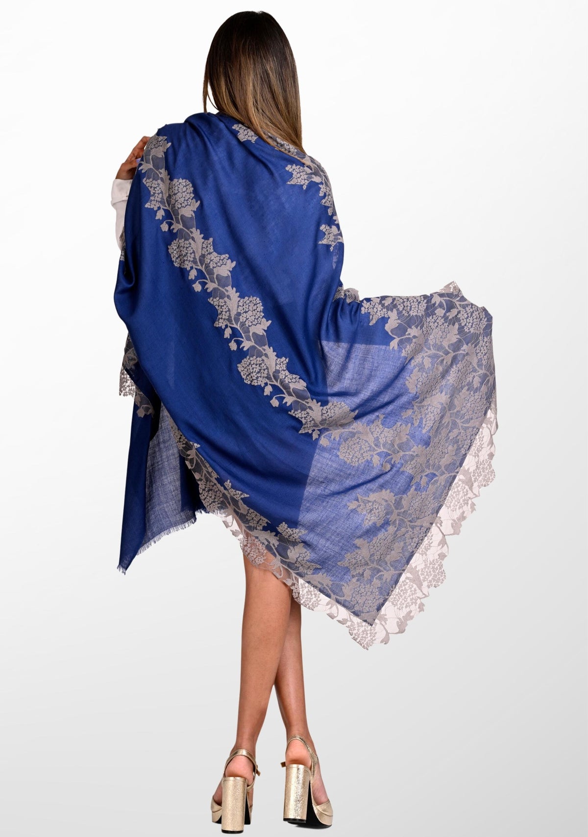 This denim blue scarf, woven from a fine blend of silk and wool, is elevated by a generous application of contrasting mousse lace in a bunch vine design. It is the perfect size that keeps you comfortably warm whilst making for a fashionable and contemporary accessory for any evening wear.