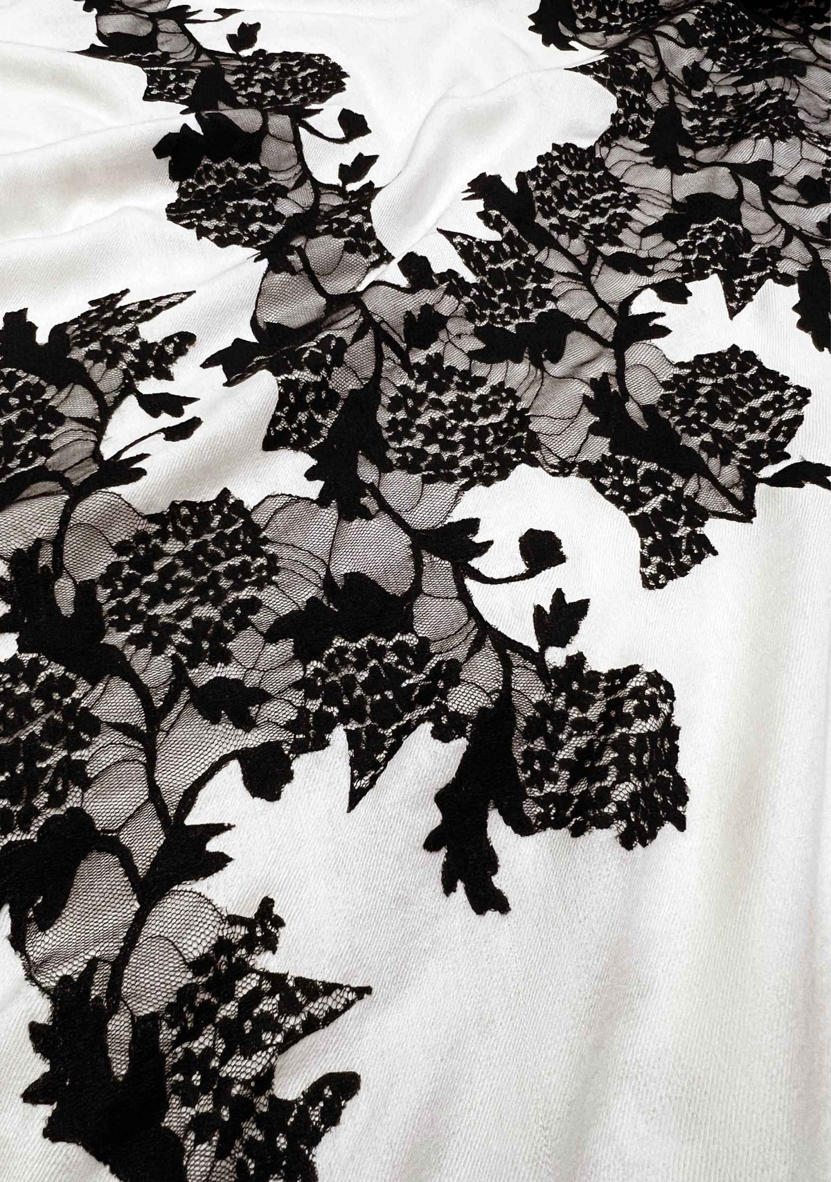 This ivory scarf, woven from a fine blend of silk and wool, is elevated by a generous application of contrasting black lace in a bunch vine design. It is the perfect size that keeps you comfortably warm whilst making for a fashionable and contemporary accessory for any evening wear.