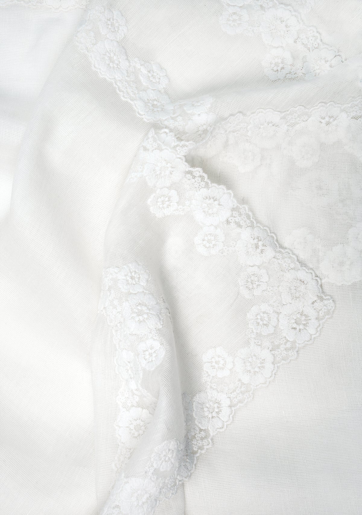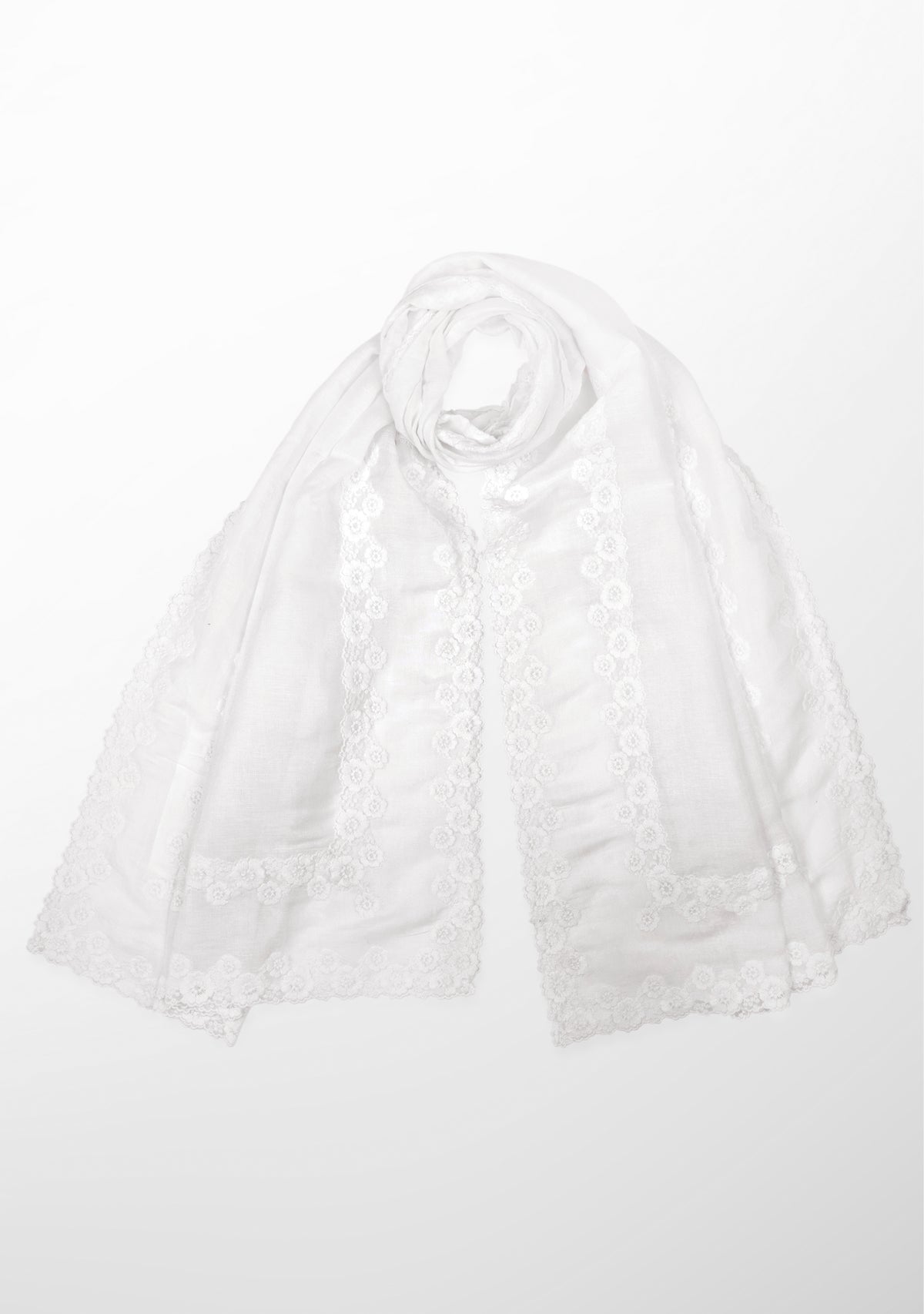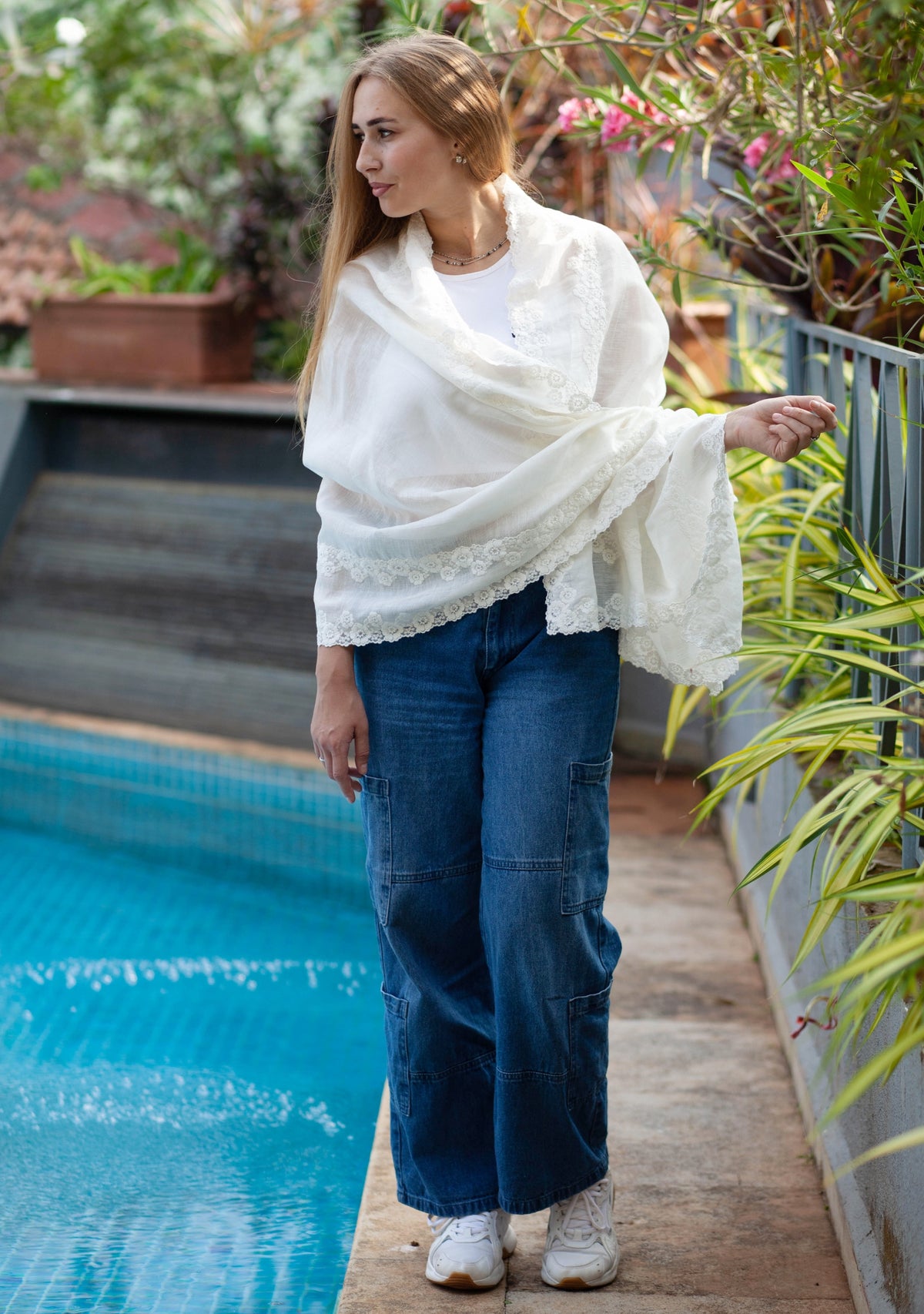 Indulge in the timeless allure of this gracefully handcrafted scarf. Created from a very light and airy linen and modal blend, this ivory scarf is emboldened by a tonal double white floral lace border. The intricate lacework, reminiscent of blooming petals, adds a touch of romance to the scarf's design, creating a captivating visual interplay. This versatile accessory effortlessly transitions from casual to formal, providing a graceful complement to any ensemble.