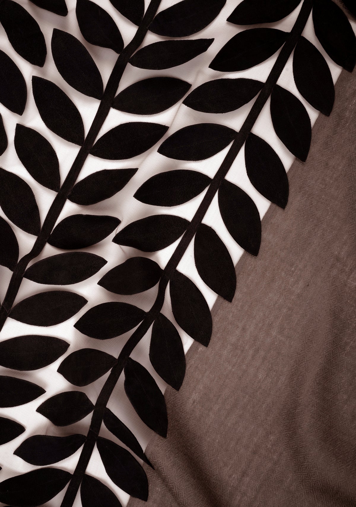 Woven from an incredibly soft cashmere, this Mousse scarf features a contrasting charcoal suede leather leaf appliqué patch cut into the center of the scarf. With wispy eyelash fringes at the ends, this signature scarf can accessorize any outfit year-round and will keep you stylishly warm whilst turning heads.