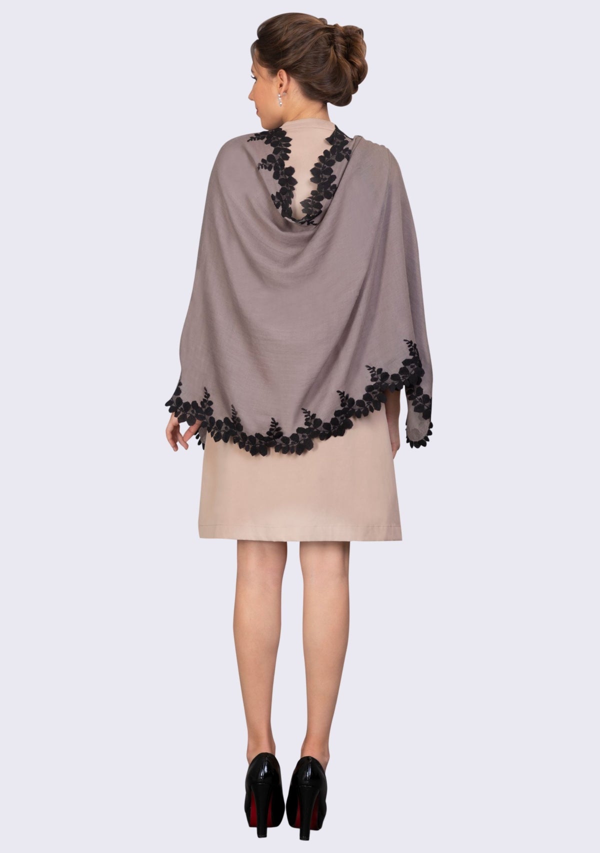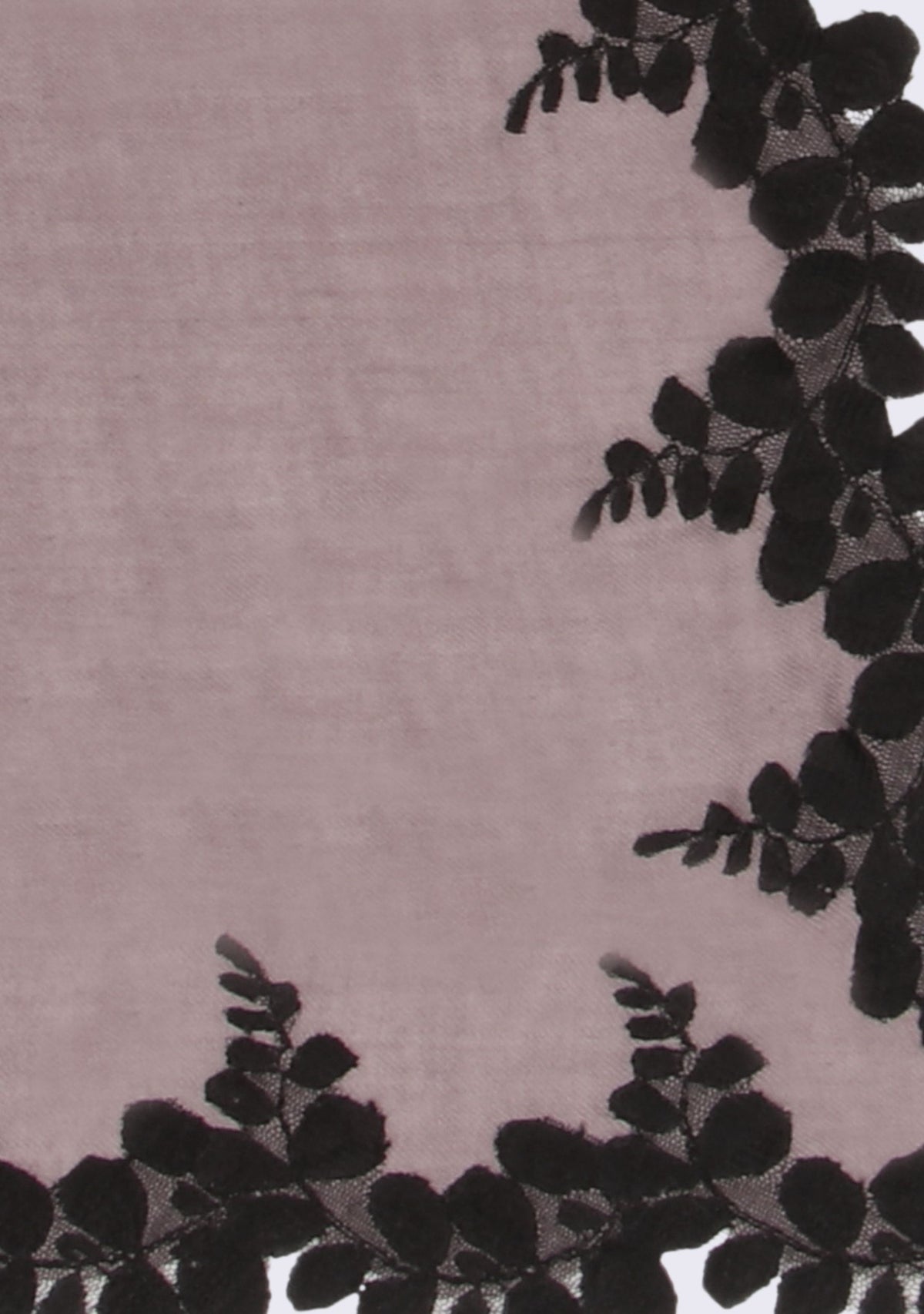 Woven from a fine silk and wool blend, this mousse scarf features a contrasting black bold scalloped edging lace border. This chic and contemporary accessory keeps you stylishly warm.