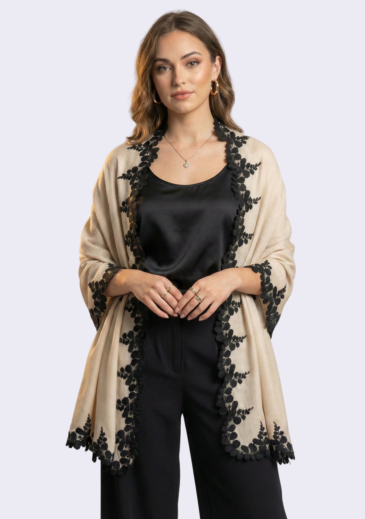 Woven from a fine silk and wool blend, this beige scarf features a contrasting black bold scalloped edging lace border. This chic and contemporary accessory keeps you stylishly warm.
