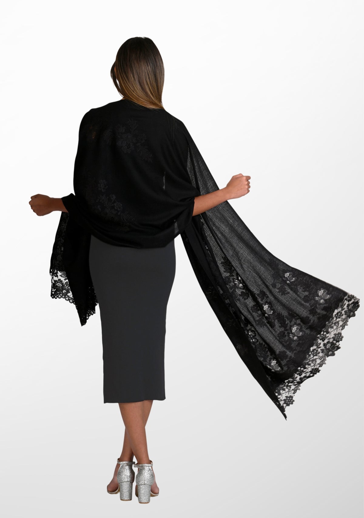 Woven from the finest cashmere, this classic black scarf features an intricately handcrafted application of an exotic tonal black Chantilly lace extending inward in a vine pattern from the ends of the scarf. The luxurious cashmere fabric ensures both warmth and comfort whilst the stunning lace application adds a touch of sophistication with unparalleled charm, giving this scarf timeless appeal with a modern edge. You can style yourself with versatile ease in multiple ways, making this scarf the perfect accessory for any formal occasion, day or night. Make heads turn with your elevated fashionista look.