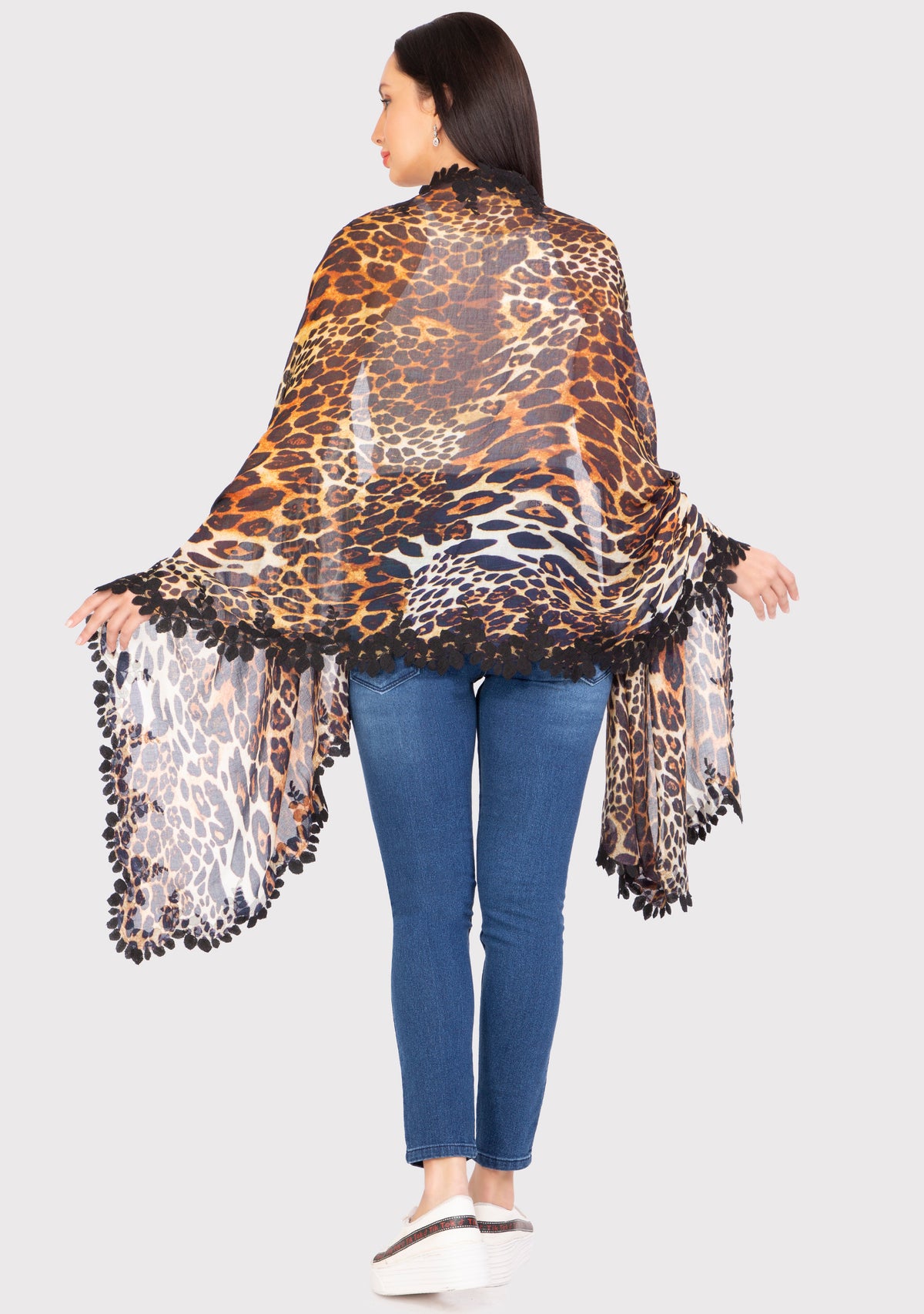 Crafted from a very soft and light modal and silk blend, this scarf features a stunning leopard print elevated by a contrasting scalloped black bold leaf-patterned lace border. Simply a classic for any time wear.