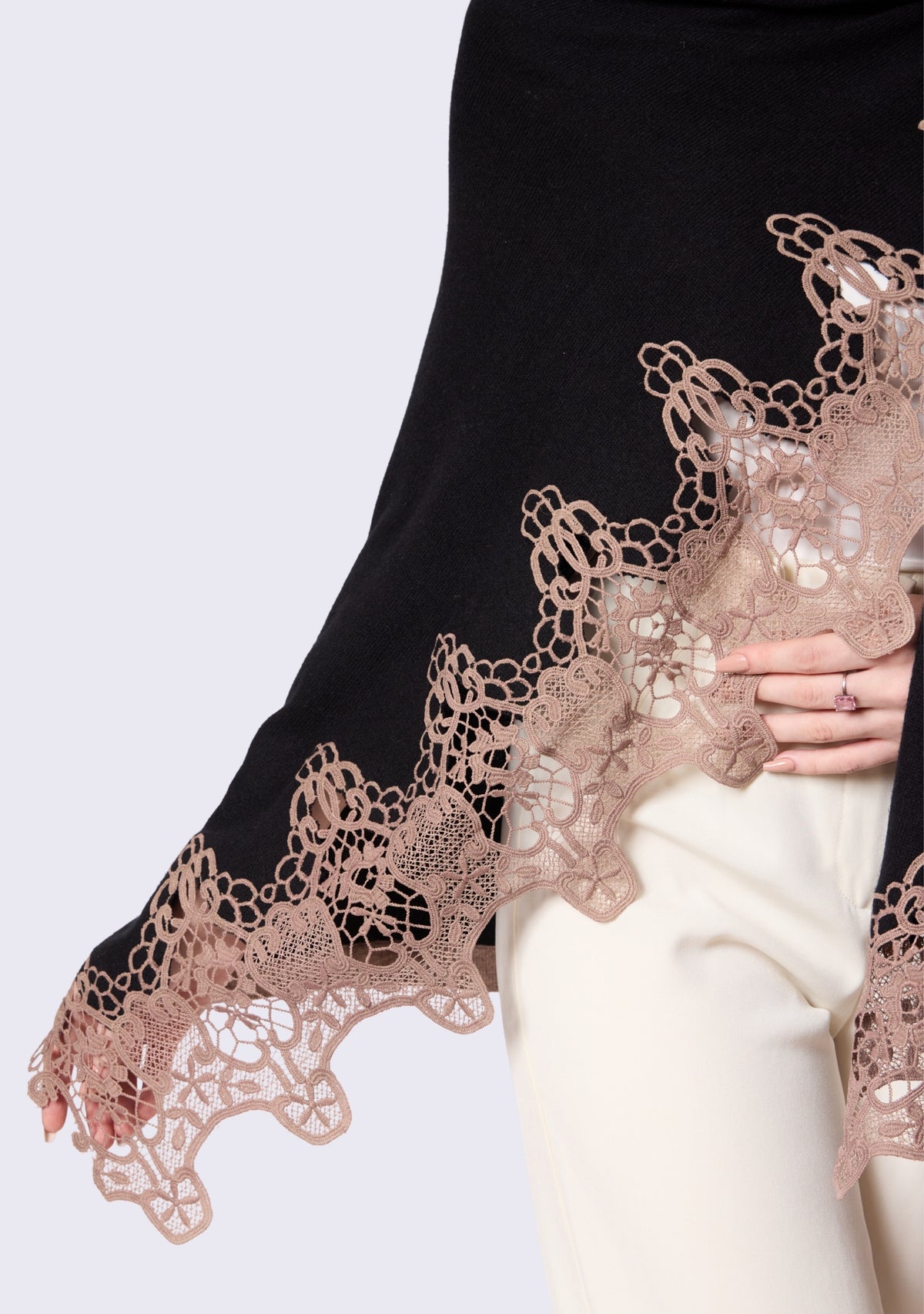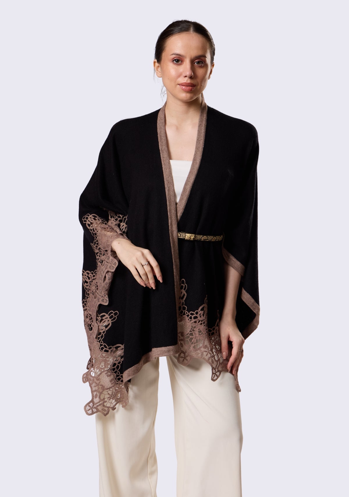 Designed for effortless movement and refined versatility, this black fine wool cape is an elegant companion for life on the go. Beautiful taupe lace is seemlessly applied along the edges, lending contrast, texture, and a touch of femininity to its timeless silhouette. Crafted from fine wool, it offers lightweight warmth and a graceful drape, making it the perfect layer for travel, cool evenings, and the changing seasons.
