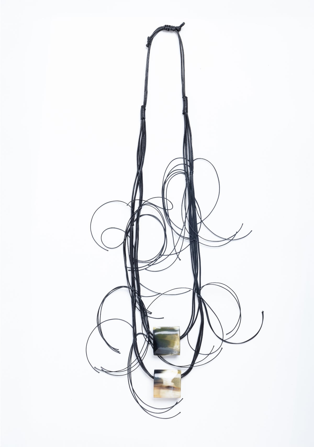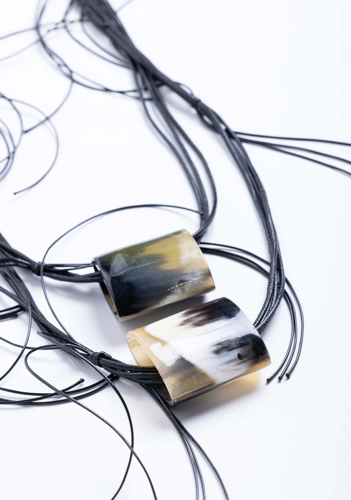 Elevate your style with this exquisite bunched cord necklace featuring ethically sourced buffalo horn pendants. The necklace is designed with multiple strands of black cord, creating a striking yet relaxed aesthetic that beautifully complements the earthy hues of the pendants. The pendants themselves are perfectly polished, showcasing their unique patterns and the interplay of dark, natural and ivory tones reflecting light beautifully. This handcrafted piece is lightweight and comfortable, making it ideal for everyday wear or special occasions. The adjustable design allows for versatility in length, ensuring a perfect fit for any neckline. Embrace the beauty of sustainable materials with this elegant necklace, which seamlessly combines style and nature.