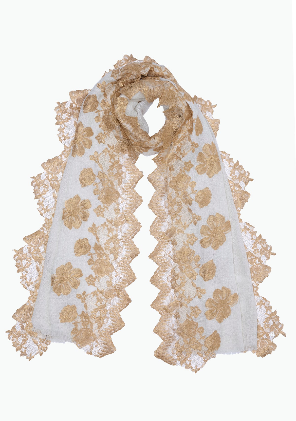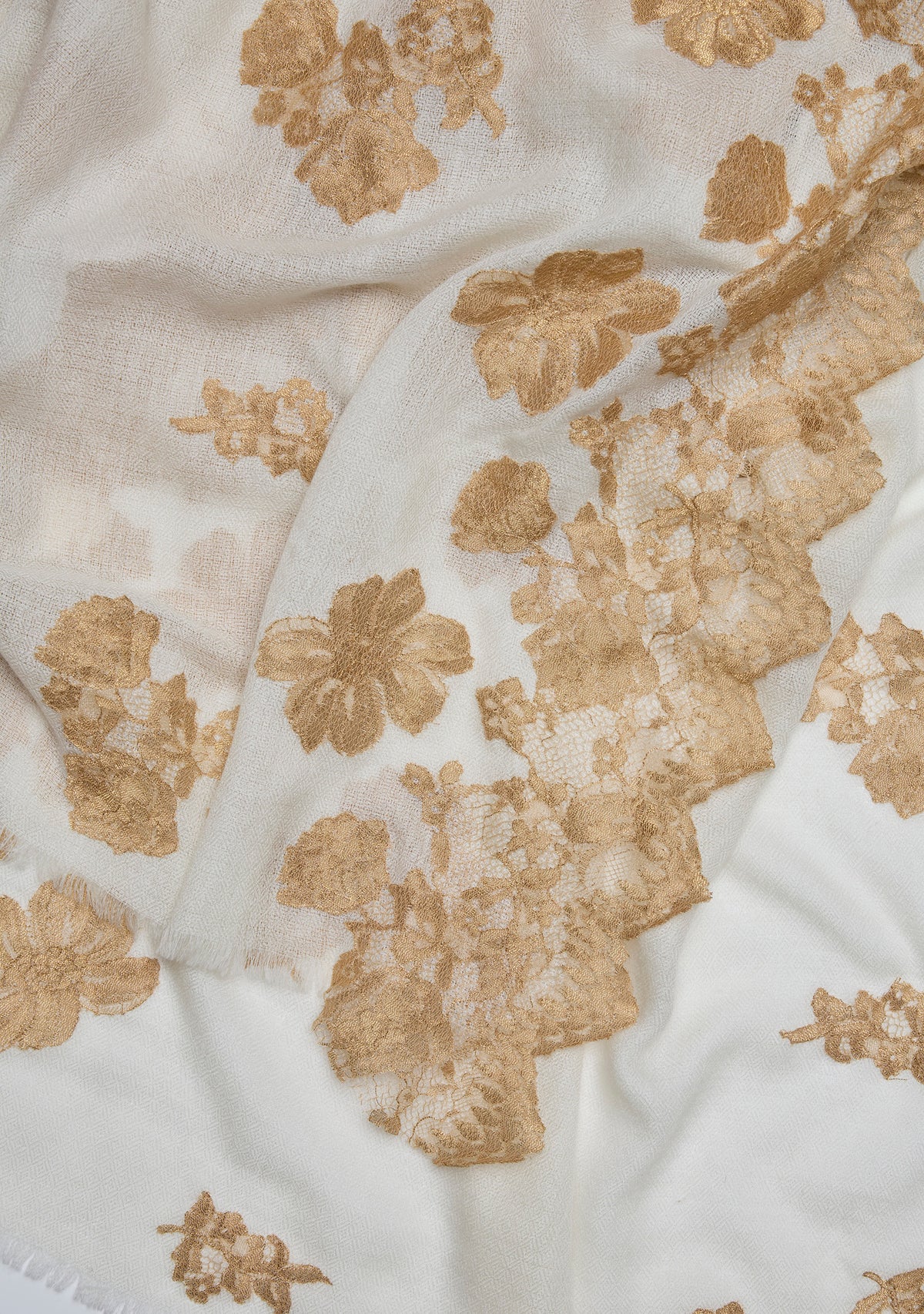 This Ivory Cashmere Scarf is a true statement of elegance, featuring exquisite hand cut gold Chantilly lace floral borders and motifs. The luxurious cashmere fabric offers a soft, warm feel, while the bold gold lace adds a touch of opulence and sophistication. The floral borders and finely crafted motifs provide a timeless, refined aesthetic, making this scarf the perfect accessory for formal and celebratory occasions. Ideal for wrap for women who appreciate intricate craftsmanship and luxurious design.