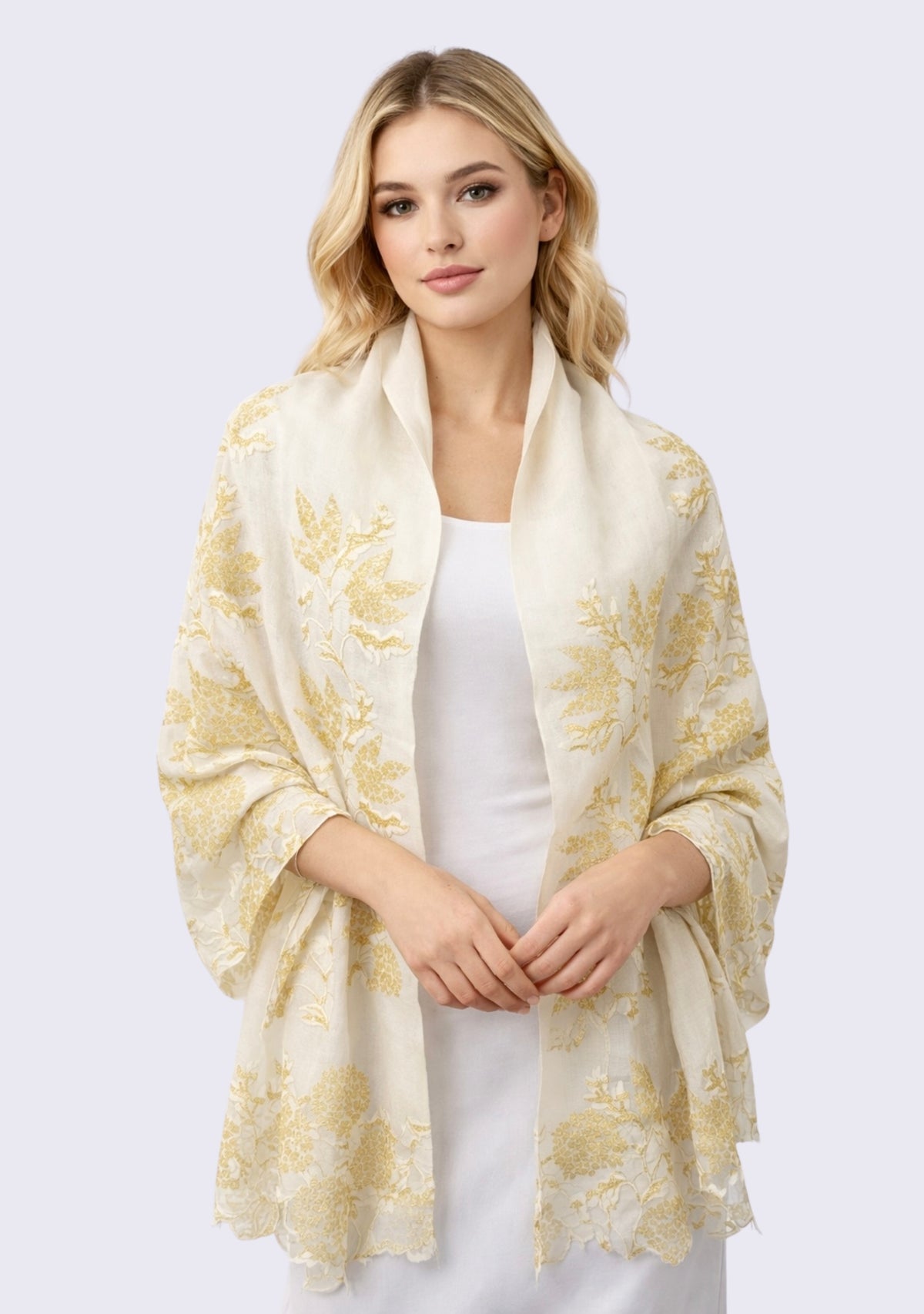 Calliope brings a captivating sense of drama to any ensemble. Woven from a luxurious blend of wool and silk, it is soft, breathable, and drapes beautifully. The bold floral lace in shimmering gold traces intricate patterns across the rich Ivory scarf.