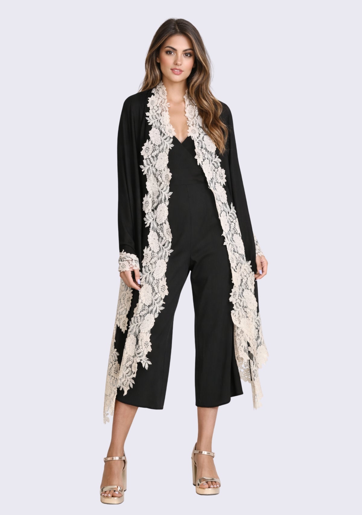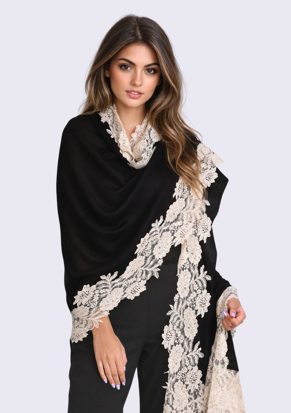 This black scarf is an all-time classic. Woven from a fine silk and wool blend, it features a contrasting beige floral lace border, making for the perfect anytime wear accessory whilst keeping you comfortably warm. For a casual or formal look, this is a must-have in every woman's wardrobe.