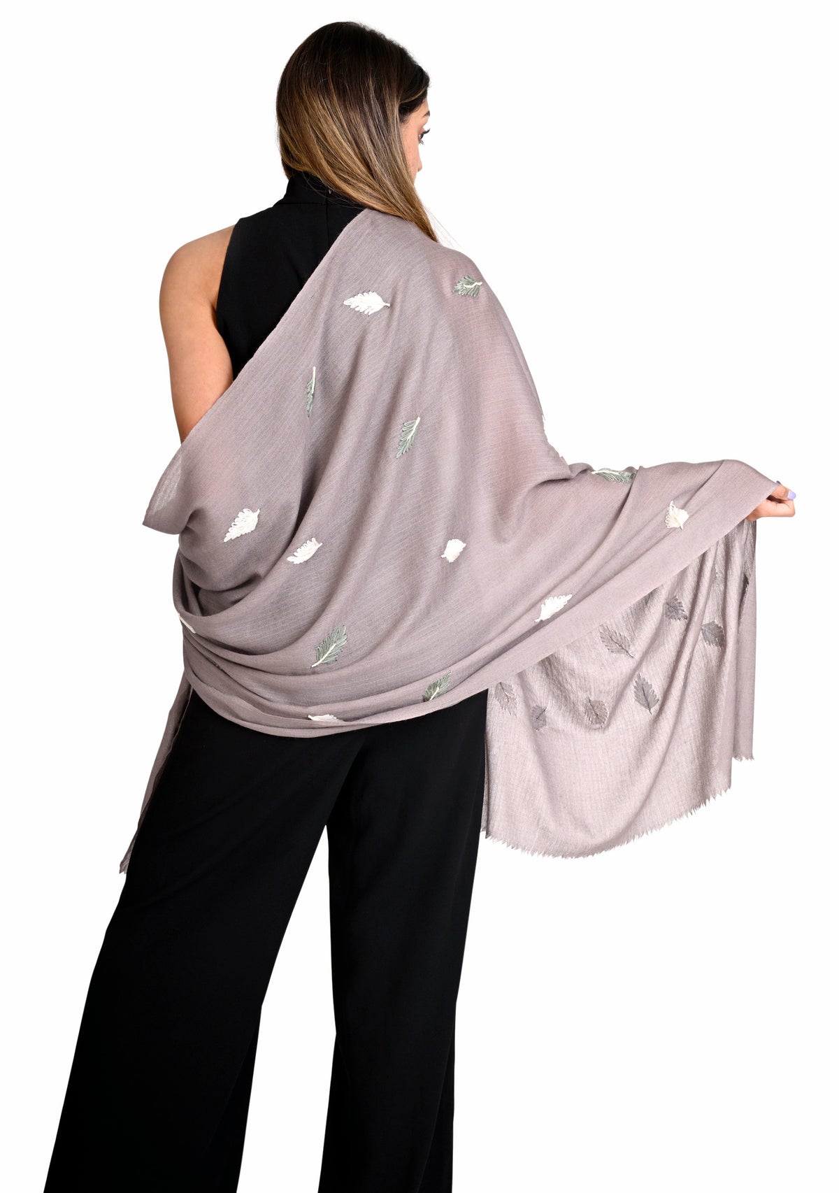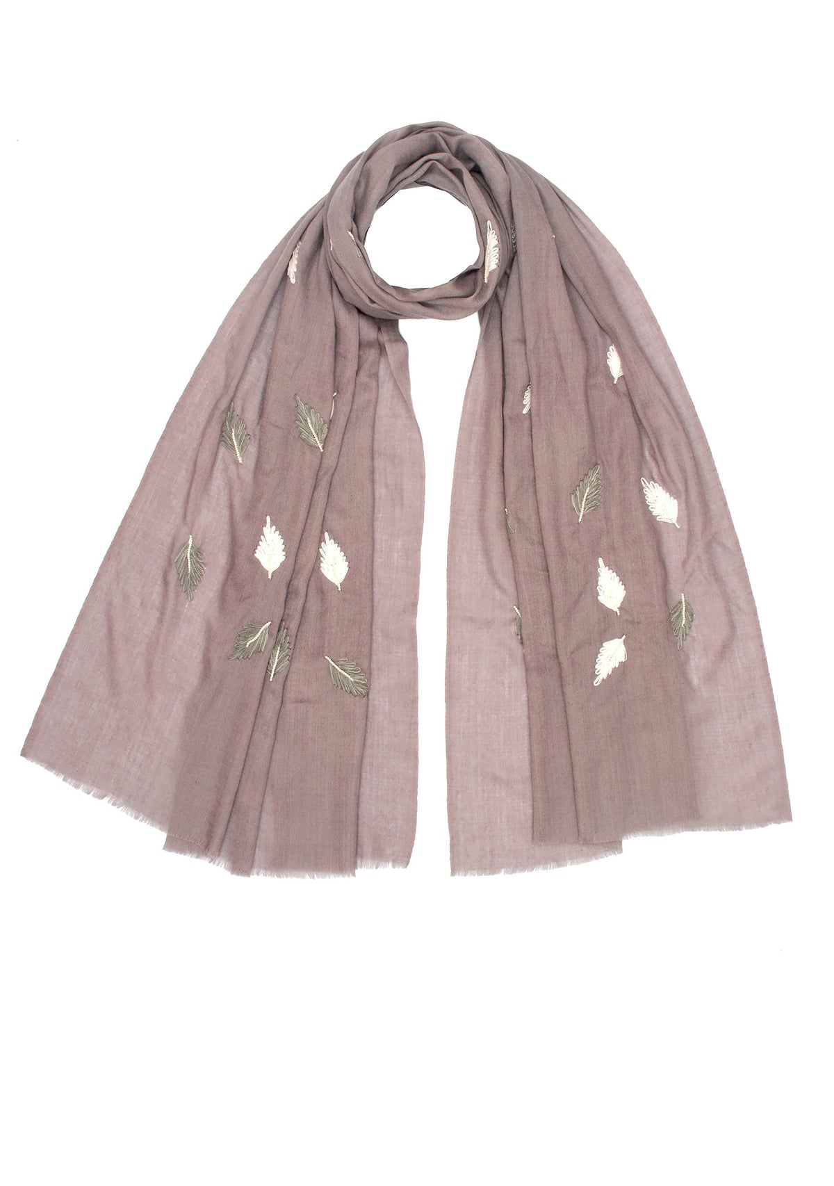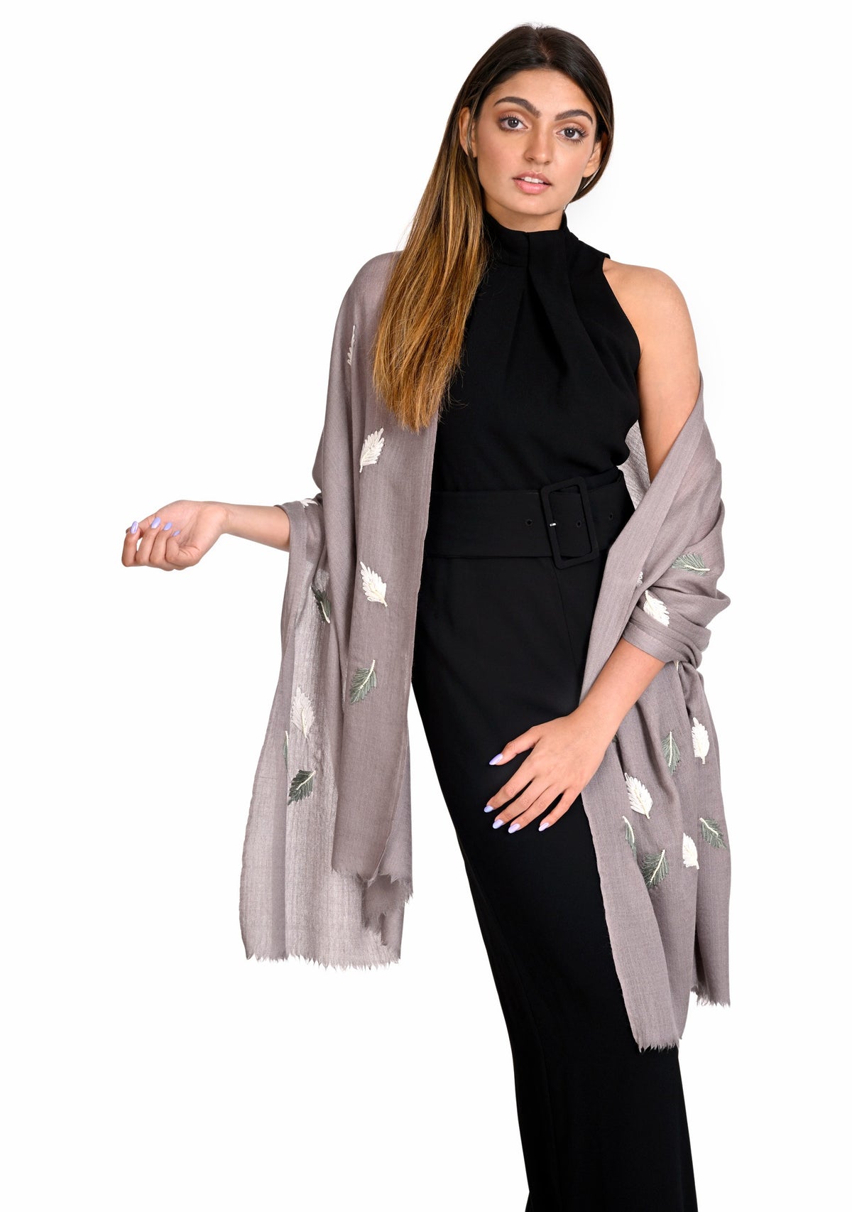This mousse scarf is woven from an incredibly soft wool and silk featuring a combination of ivory and mousse handcrafted leaf embroidery allover, further elevated by a string of ivory pearls. With an eyelash fringe finish at the ends, this scarf makes for a perfect casual yet trendy accessory to keep you fashionably warm day or night.