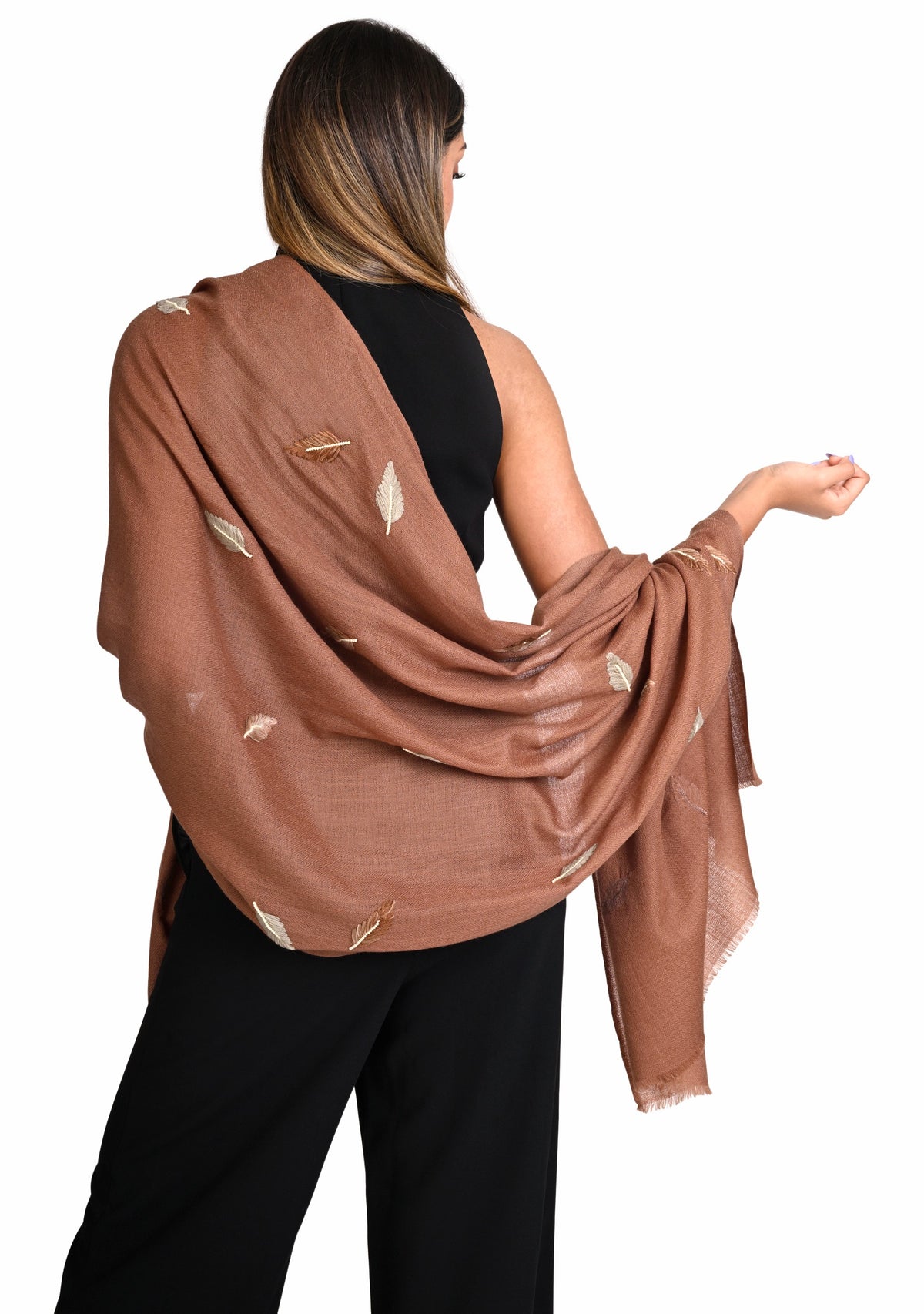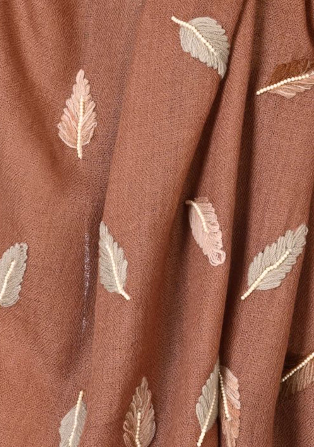 This brown scarf is woven from an incredibly soft wool and silk featuring a combination of taupe and brown handcrafted leaf embroidery all over, further elevated by a string of ivory pearls. With an eyelash fringe finish at the ends, this scarf makes for a perfect casual yet trendy accessory to keep you fashionably warm day or night.