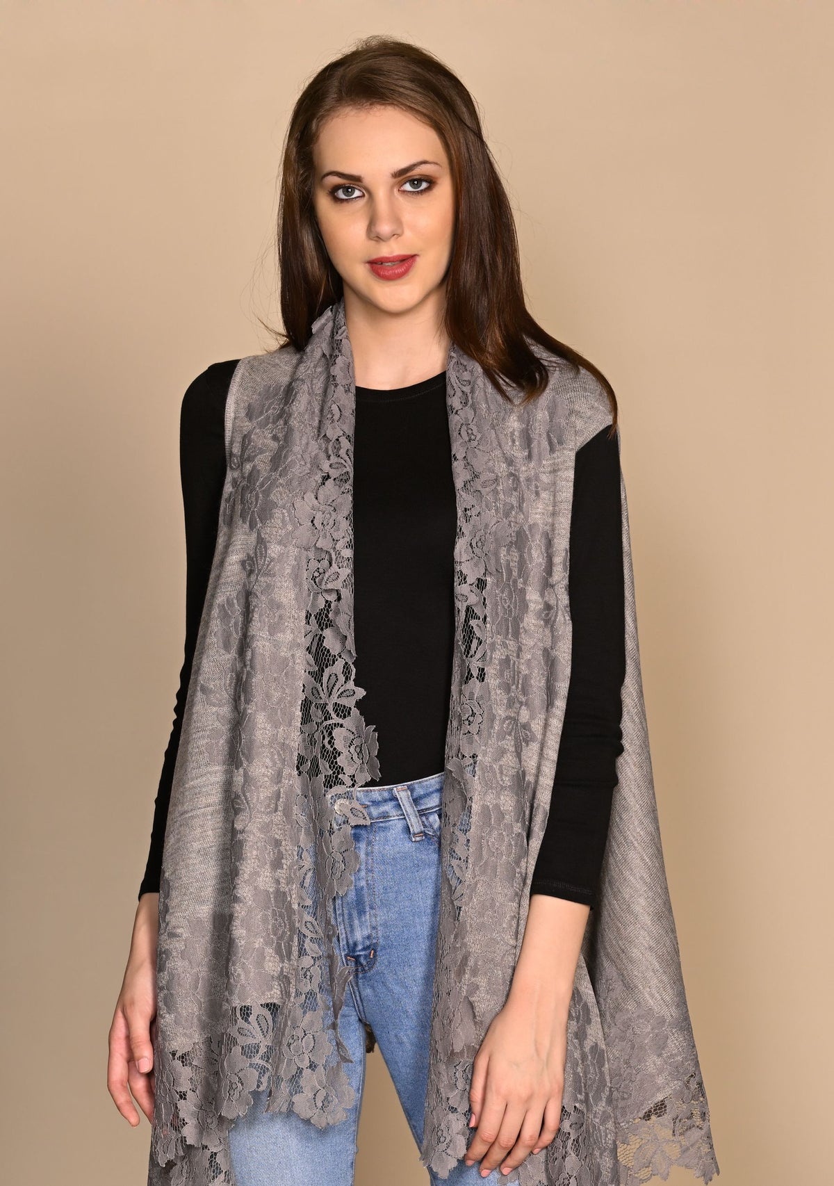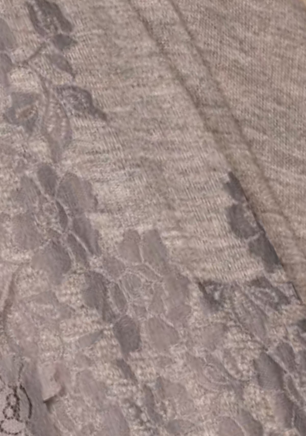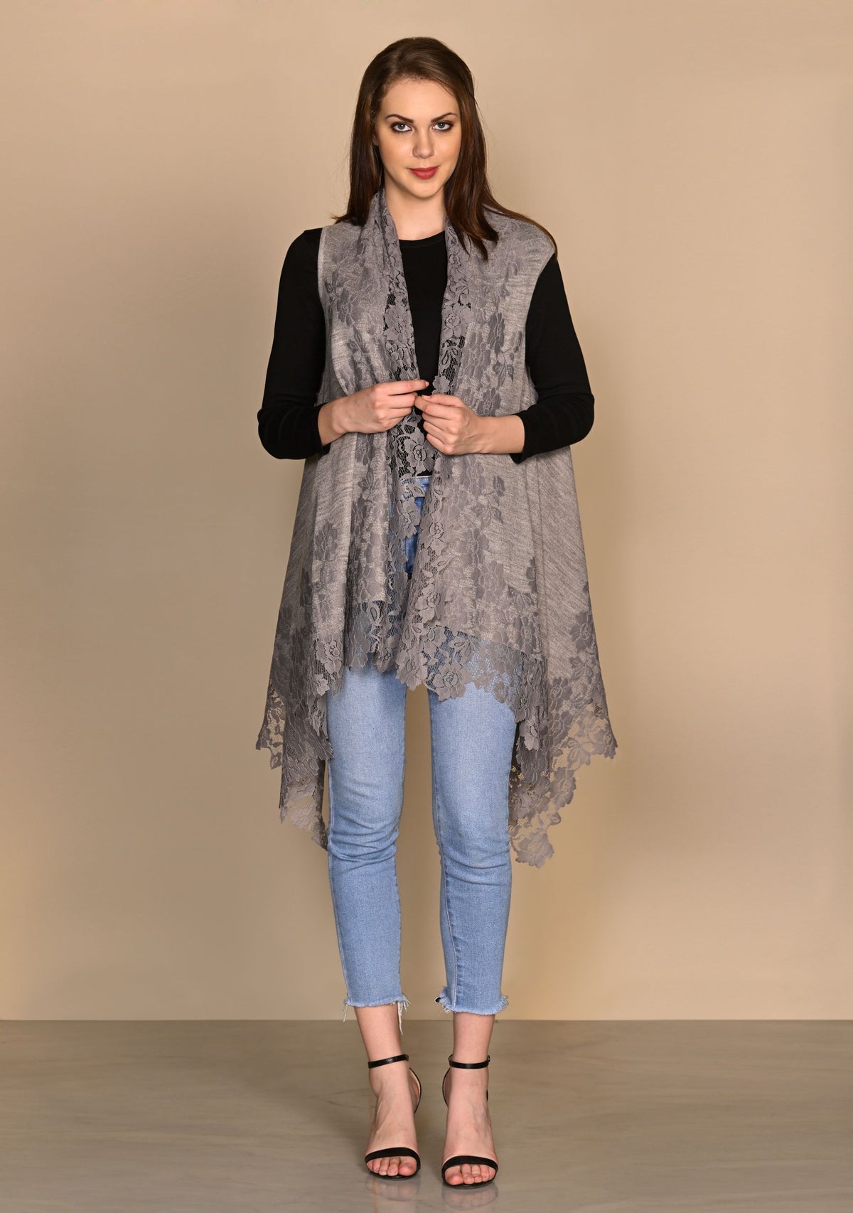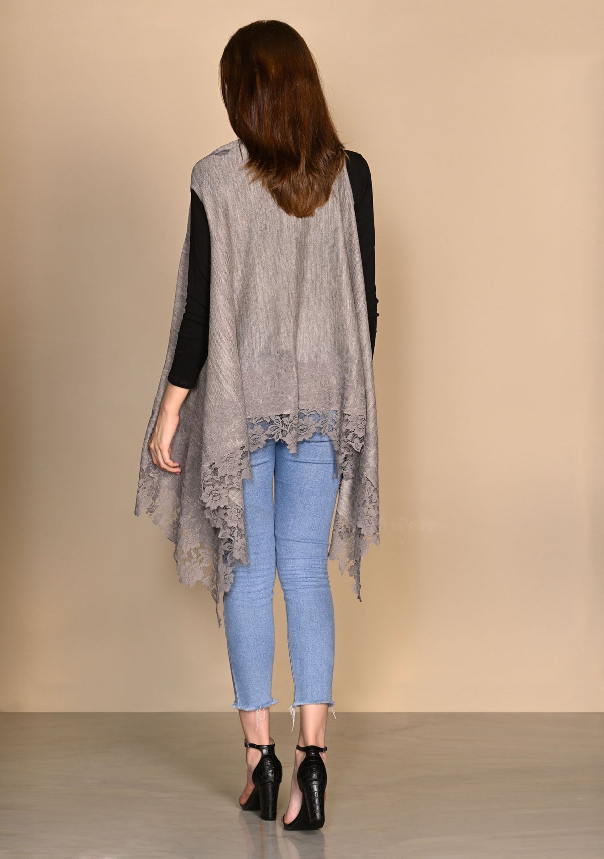 A classic taupe melange knitted sleeveless jacket crafted from a very soft fine wool. The look of this jacket is further elevated with a contrasting mousse floral lace border making it a unique accessory that can be worn over any casual attire or to keep stylishly warm whilst traveling.