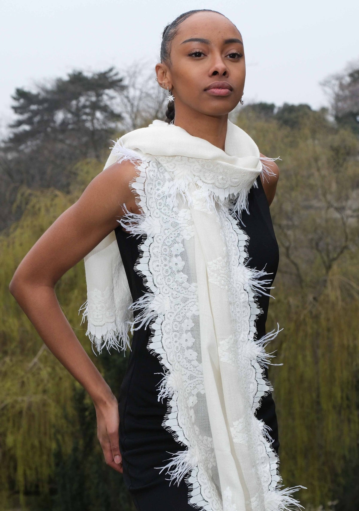 This stunning ivory and ivory scarf is woven from a very fine cashmere. Bordered in a partly tonal and partly tonal ivory Chantilly lace in a scalloped design with Ivory Ostrich feathers, this is a must have Maneesha Ruia signature scarf that will make heads turn whilst keeping you fashionably warm on any evening out.