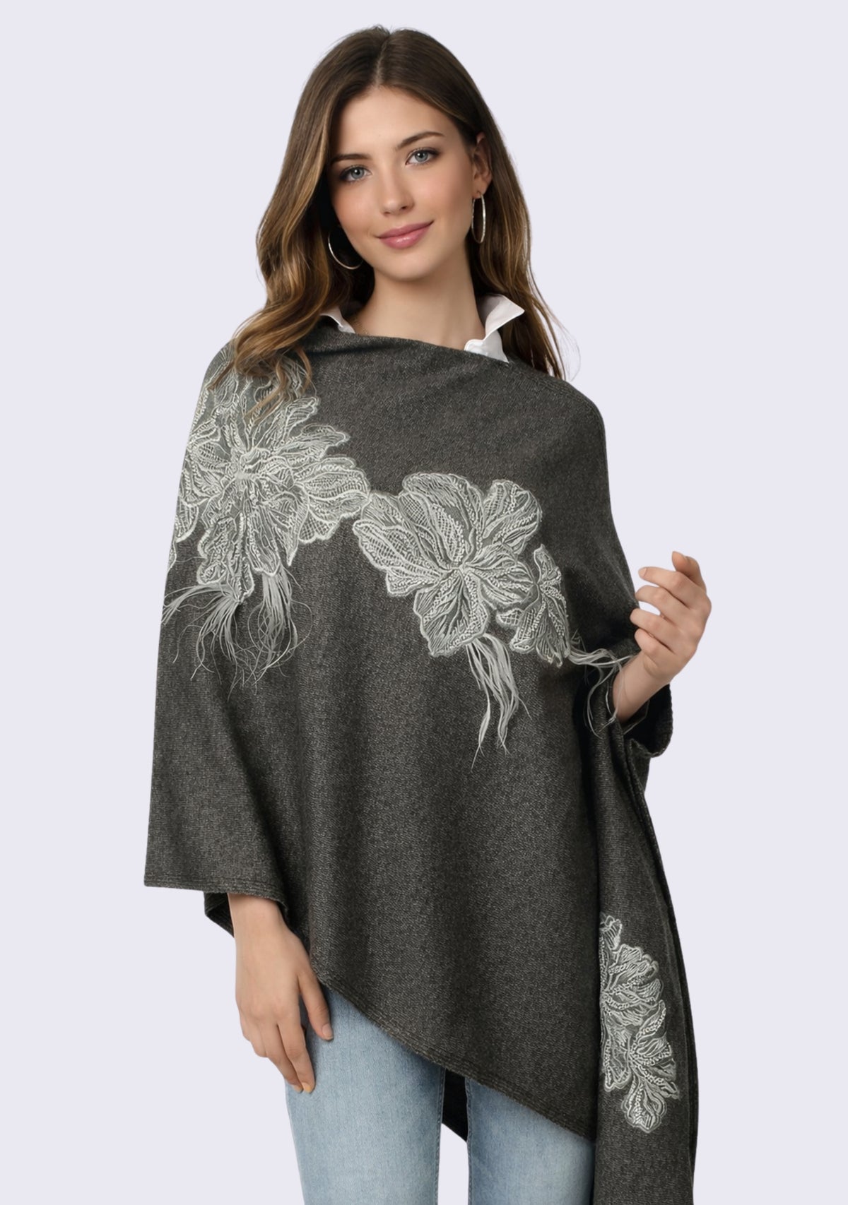Charcoal Melange Wool Poncho Lt. Gray Embroidery & Feather Applique