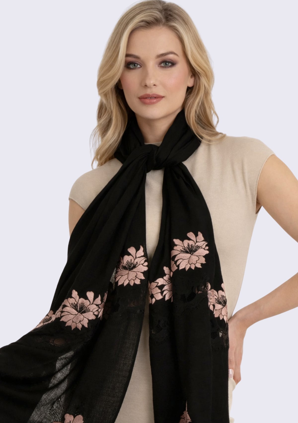 Black Cashmere ScarfLt. Copper Embroidery & Black Lace
