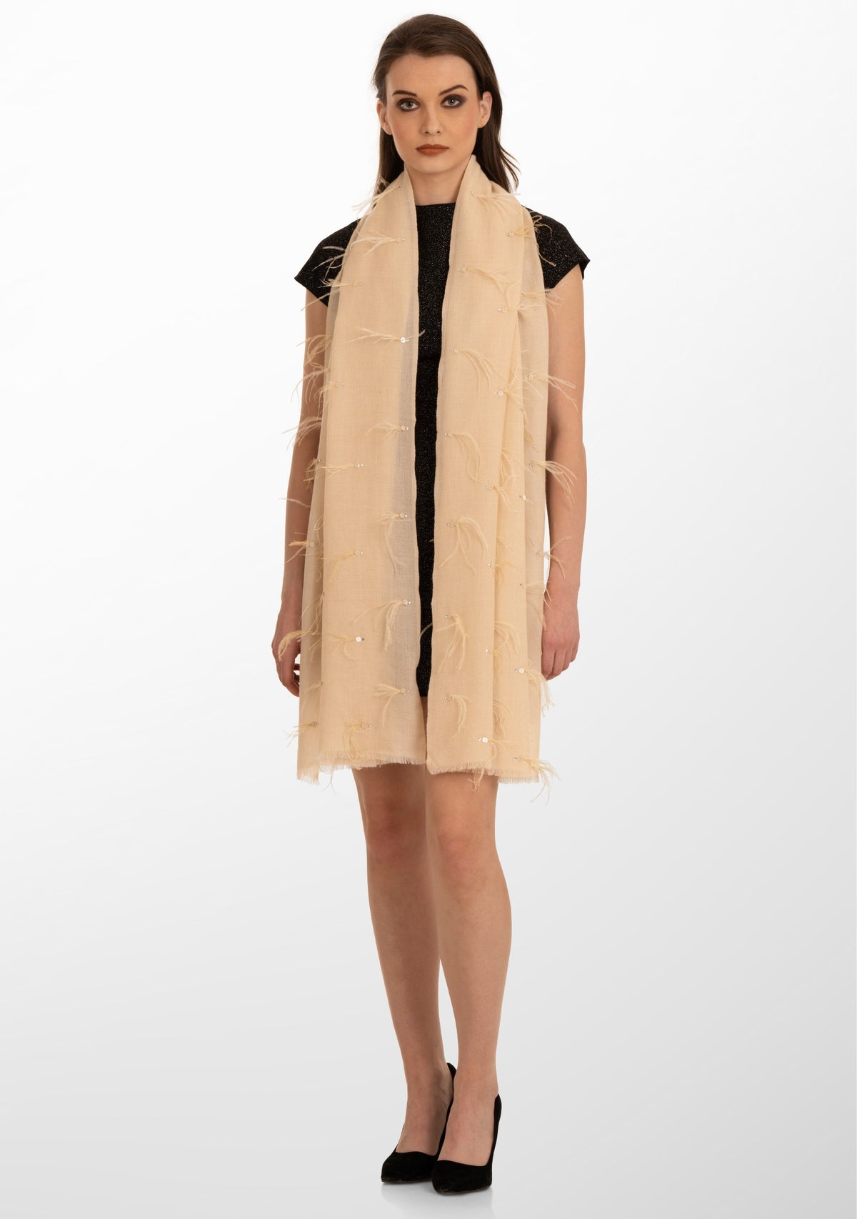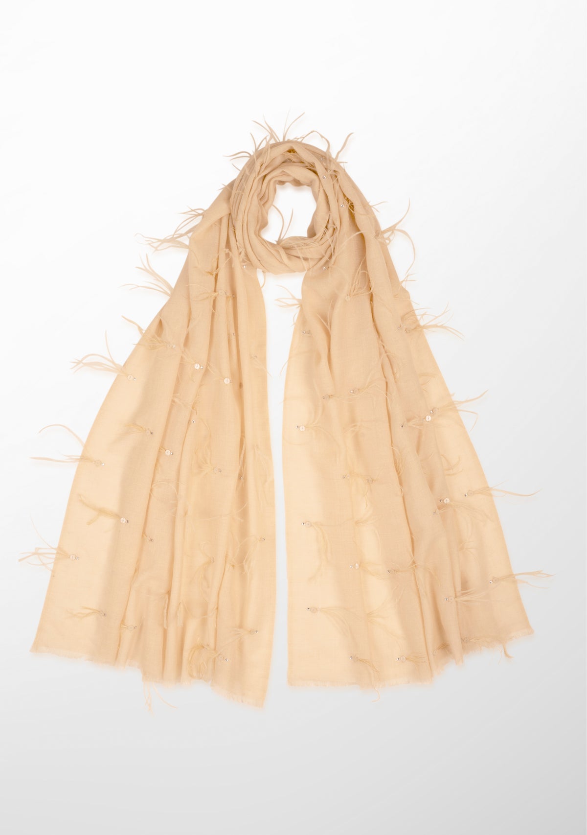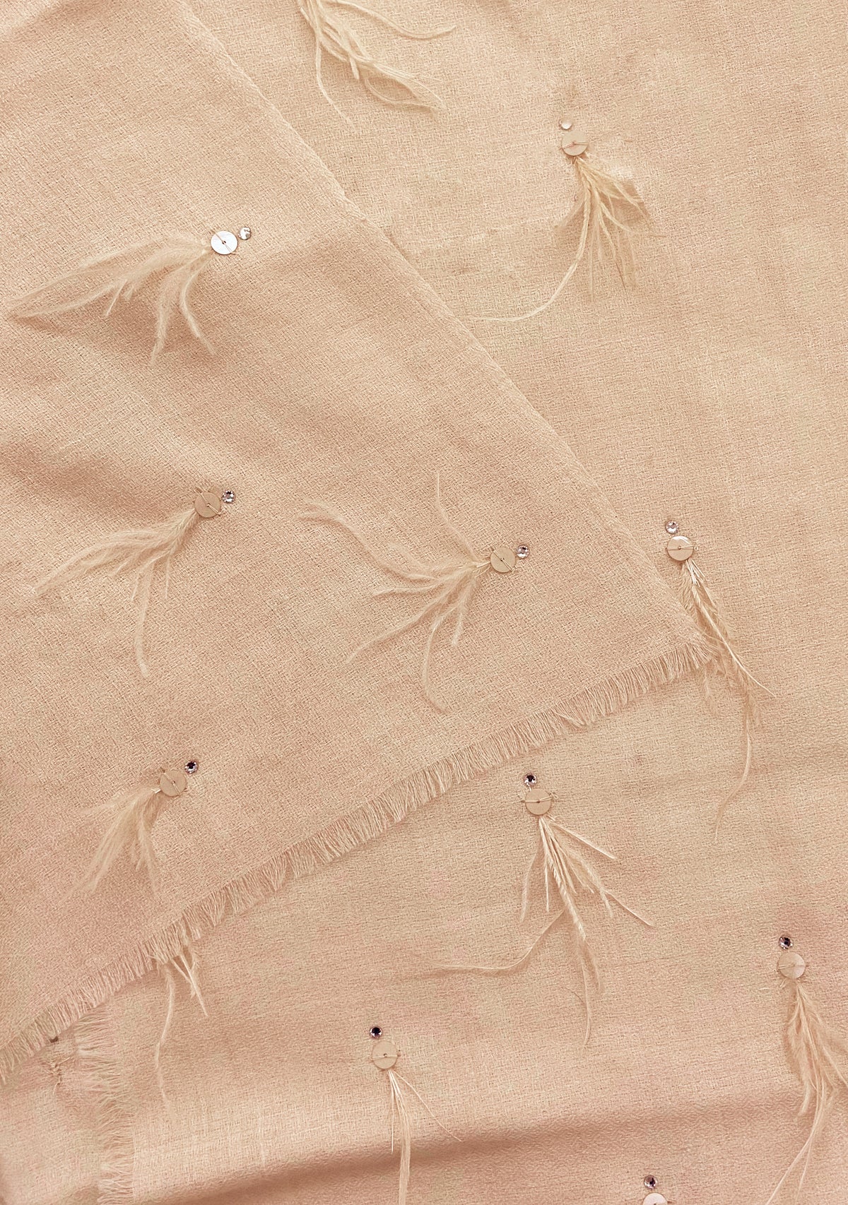 Beige Cashmere Pashmina ScarfBeige Ostrich Feathers, Sequin & Silver Swarovski Crystal